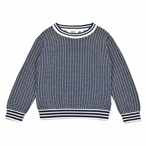 Klassisk Fiskartröja/Islendertröja till barn. Tröjan är stickad i 100% ekologisk bomull med ett klassiskt mönster som för tankarna till havet. Tillgänglig i två olika färgställningar; vit på blå eller blå på vit. Hållbart tillverkad i 100% ekologisk bomull.