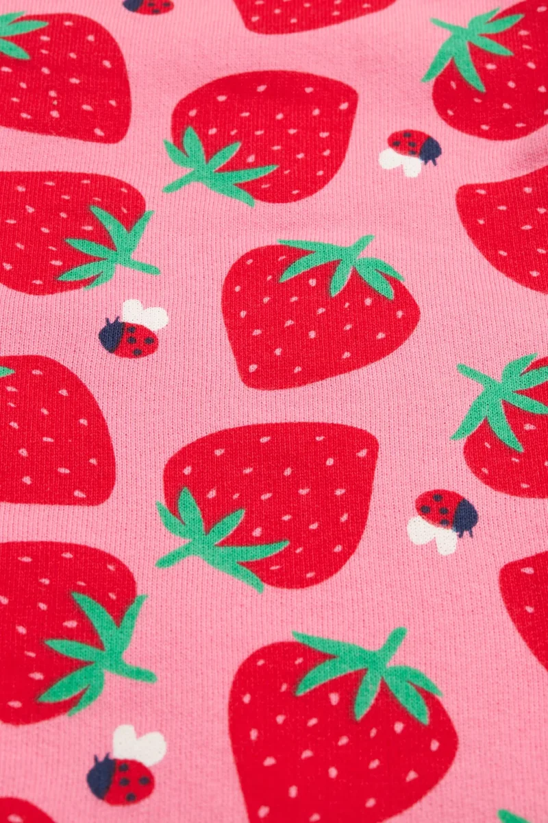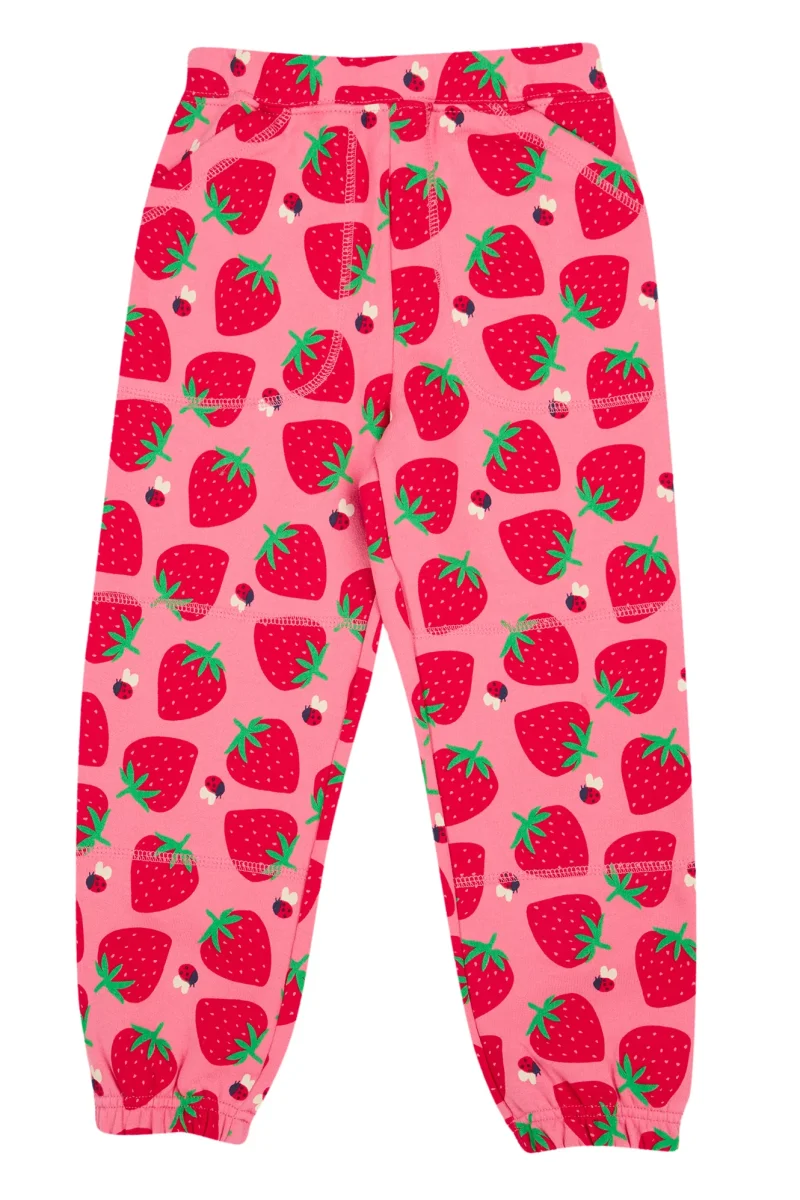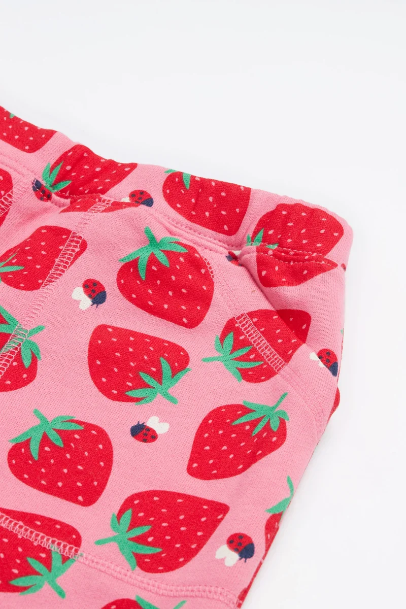 Mjukisbyxor från Frugi i ekologisk bomull med mjuk borstad insida och härligt jordgubbsmönster. Två fickor fram och förstärkta knän för ökad slitstyrka.