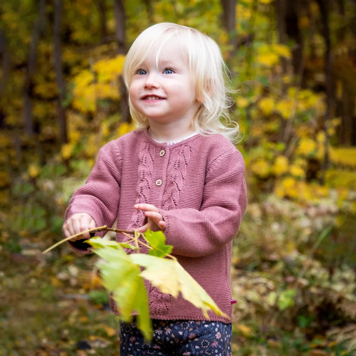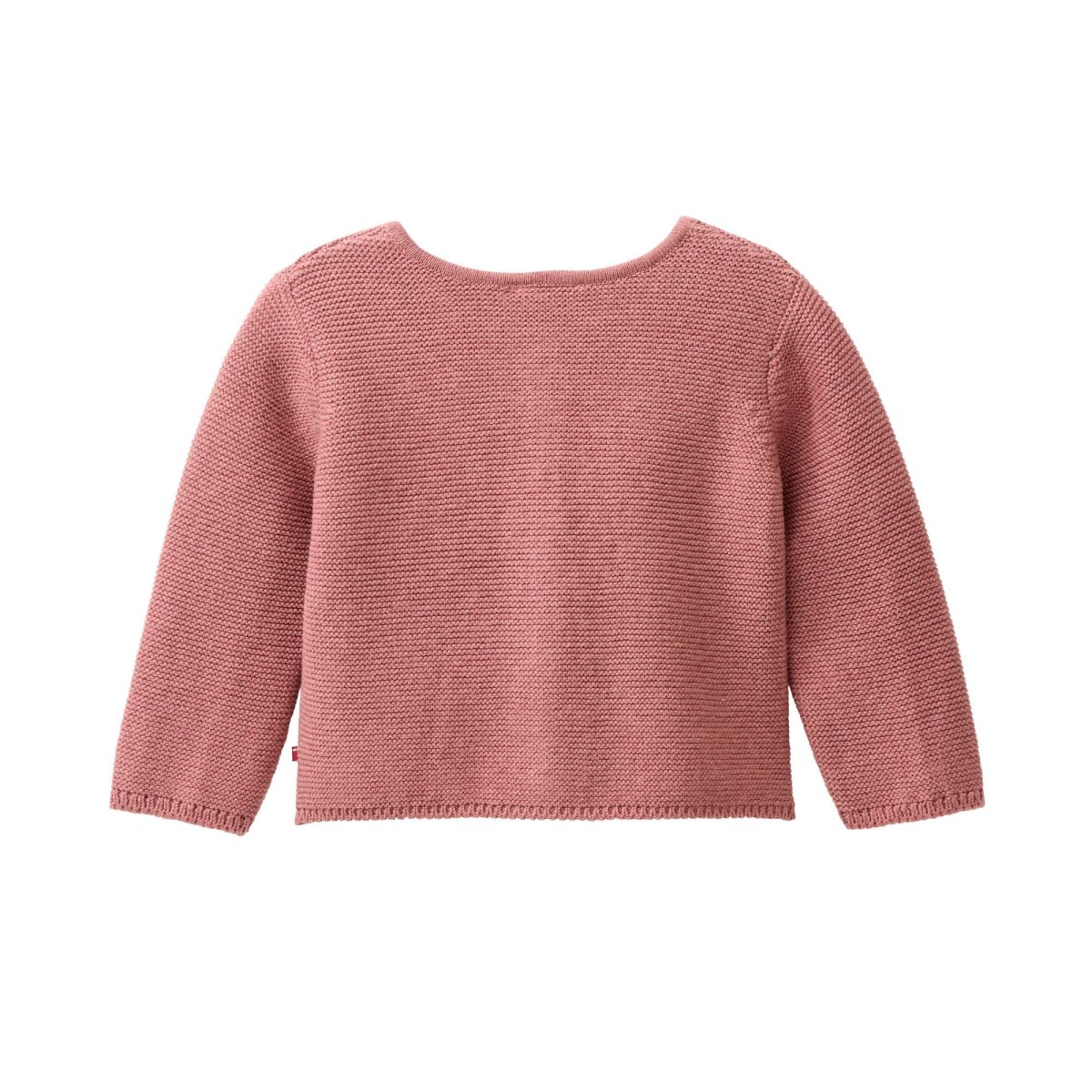 En underbart fin kofta för baby och barn som är rätstickad med en vacker bård längst knäppkanten. Koftan är stickad i mjuk och skön ekologisk bomull och har knappar av trä.