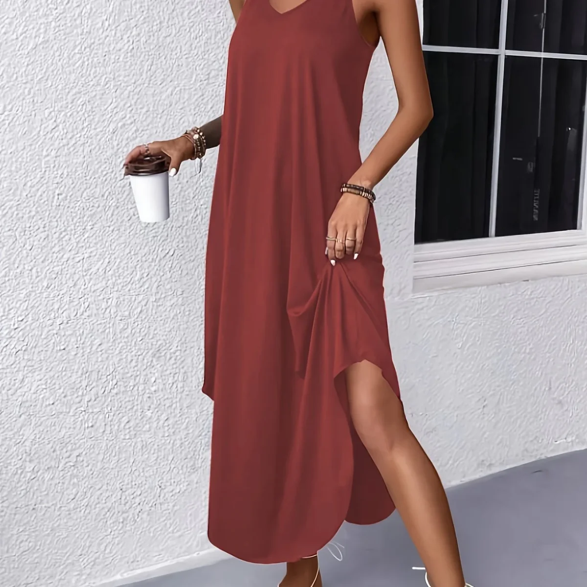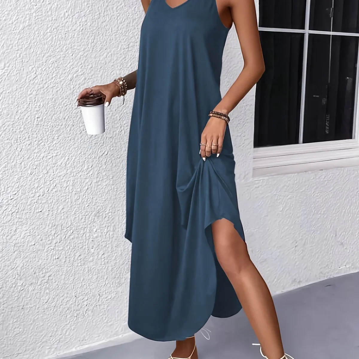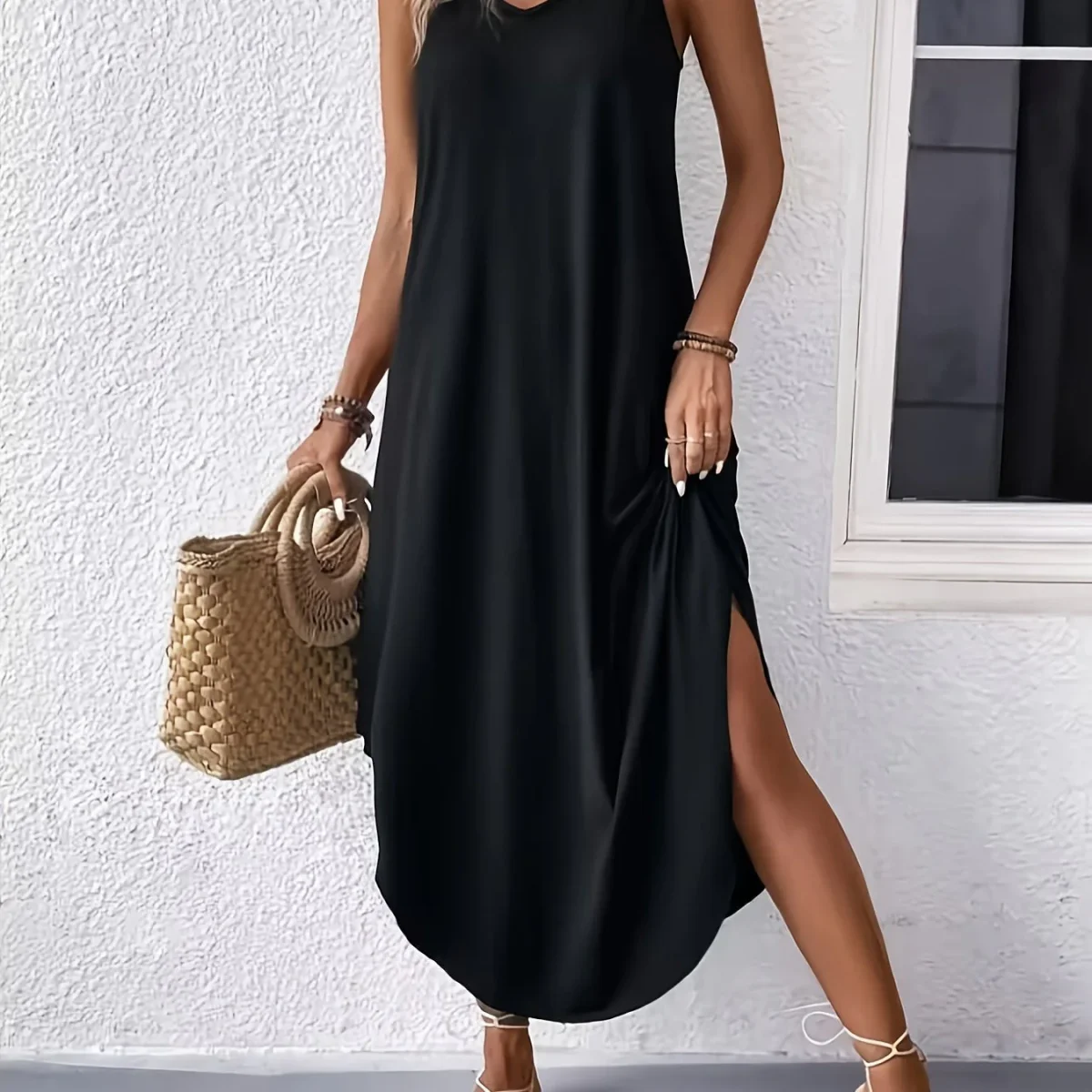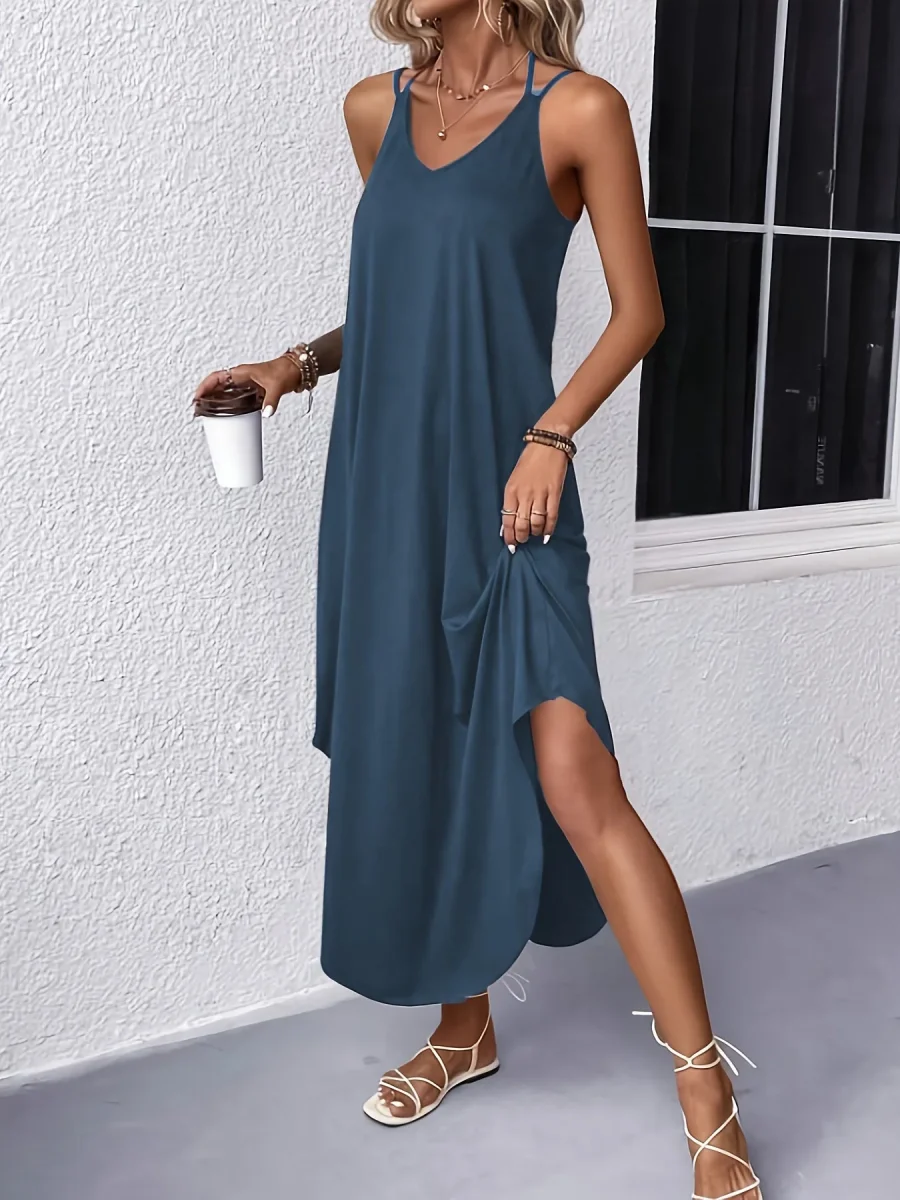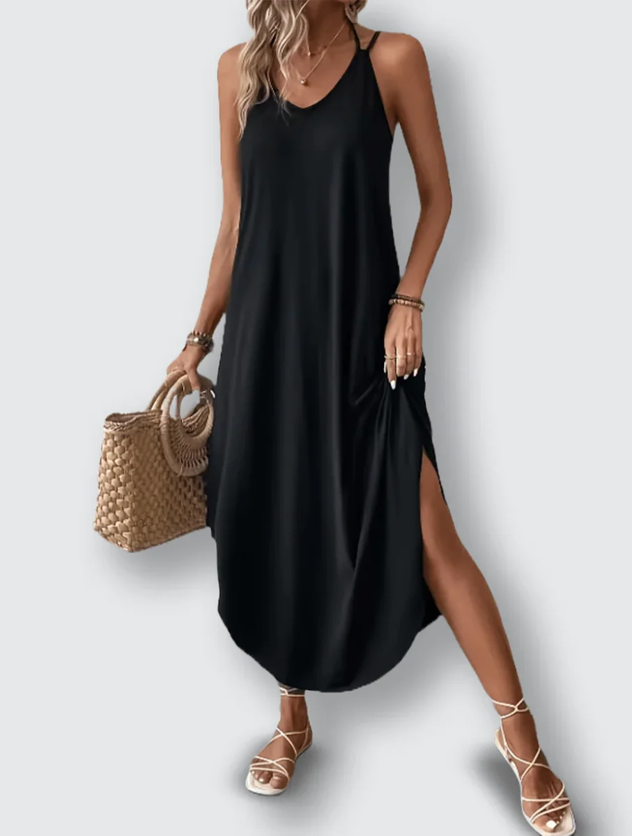 Noa har en lös passform och smala axelband som framhäver dina axlar och ger en feminin siluett. Den diskreta slitsen i sidan ger klänningen en lekfull touch och gör den perfekt för både vardag och sommarens alla tillfällen.