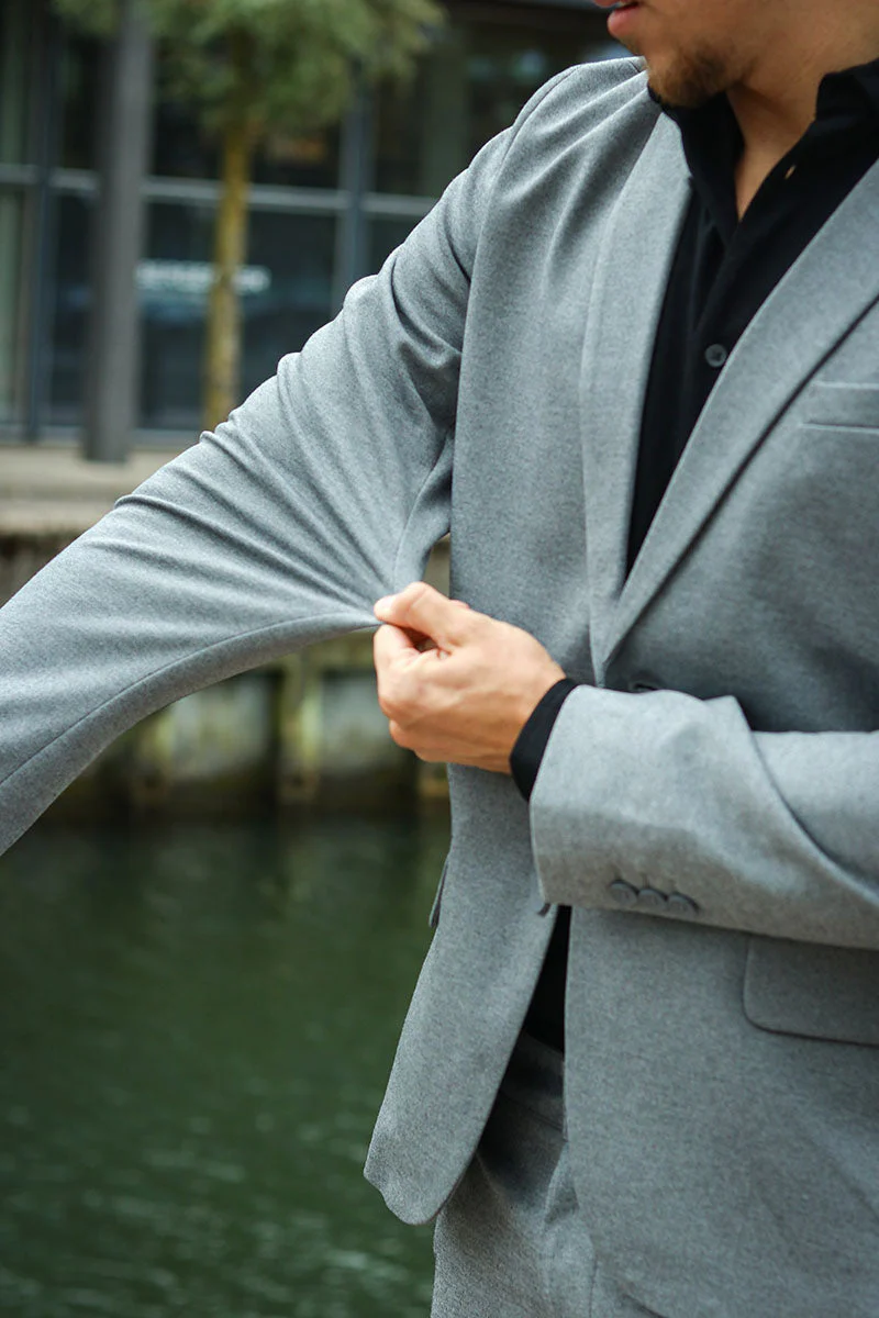 Den här slim fit-blazern i medium grå melange är ett perfekt val för vuxna som vill klä upp sig för festliga tillfällen. Med en omvänd krage och en smal passform ger den en elegant och modern silhuett. Materialkompositionen, bestående av viscose, återvunnen polyester och elastan, skapar en behaglig och flexibel känsla som gör plagget bekvämt att bära under längre tider.