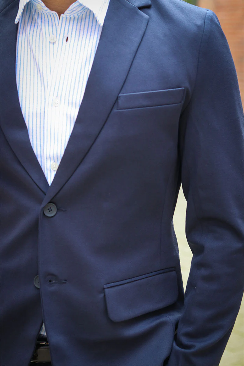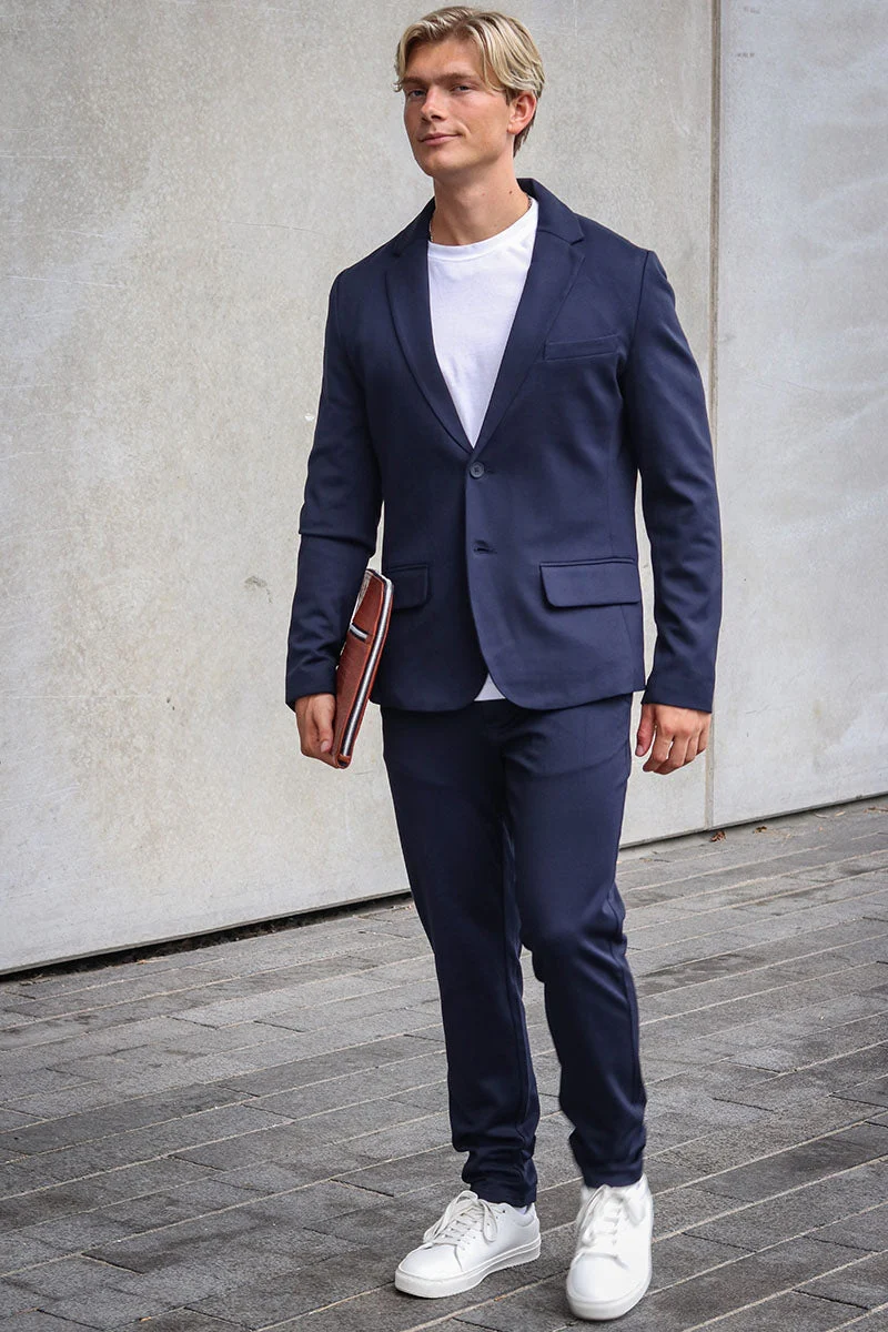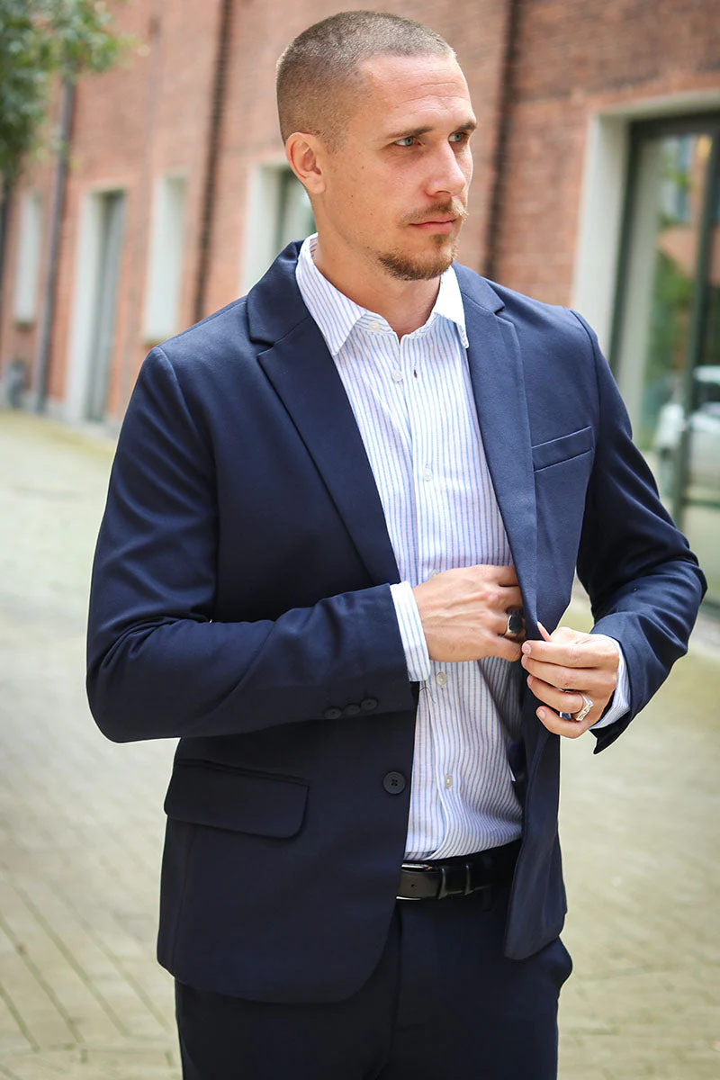 Denna slim fit-blazer har en stilren reverskrage som ger en elegant silhuett. Den mörkblå färgen, kallad Night sky, passar perfekt för formella tillfällen och festliga tillställningar där du vill synas. Materialen kombinerar viscose med återvunnen polyester och elastan, vilket ger plagget både komfort och god passform.