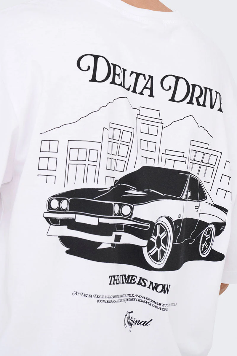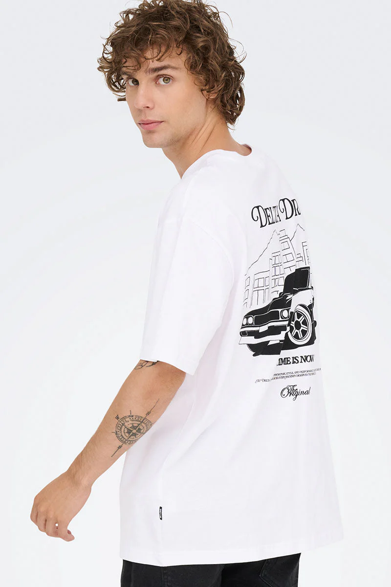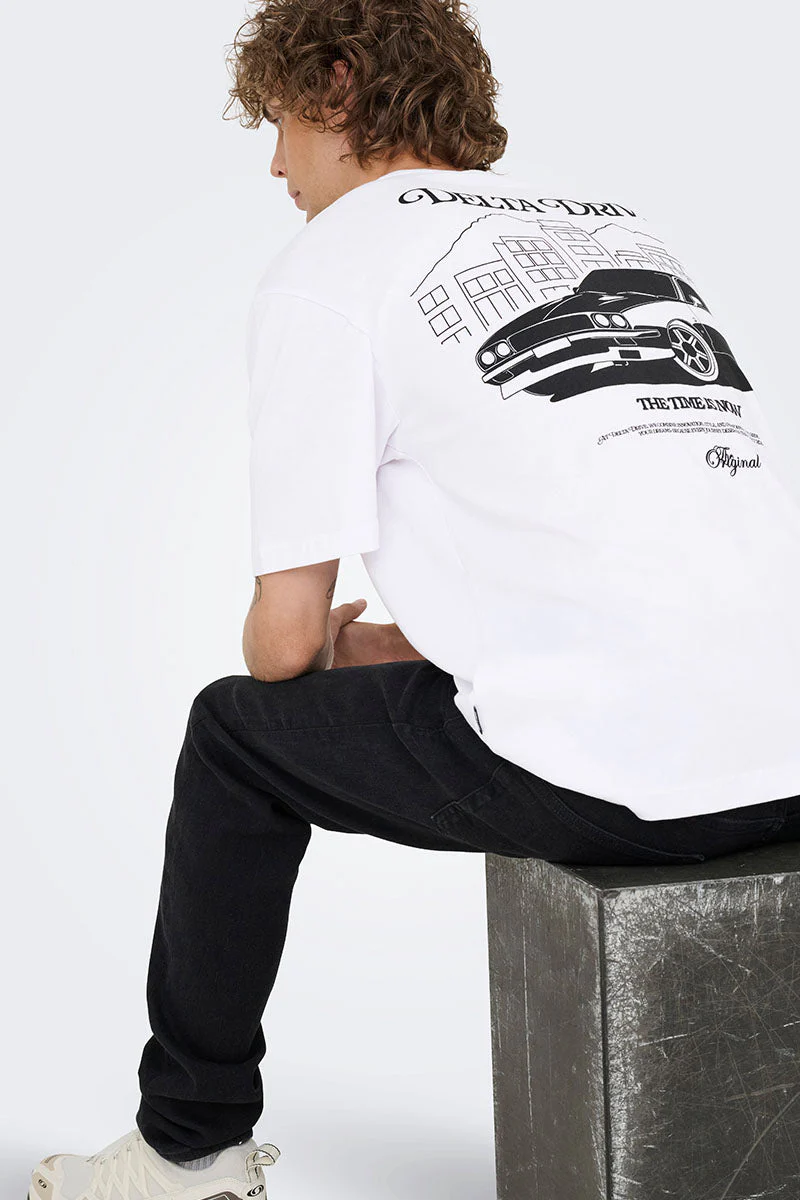 - T‑shirt med stort tryck på ryggen och mindre tryck på bröstet