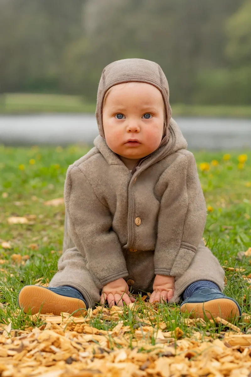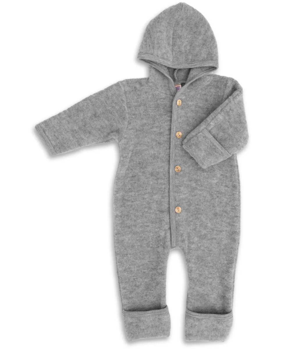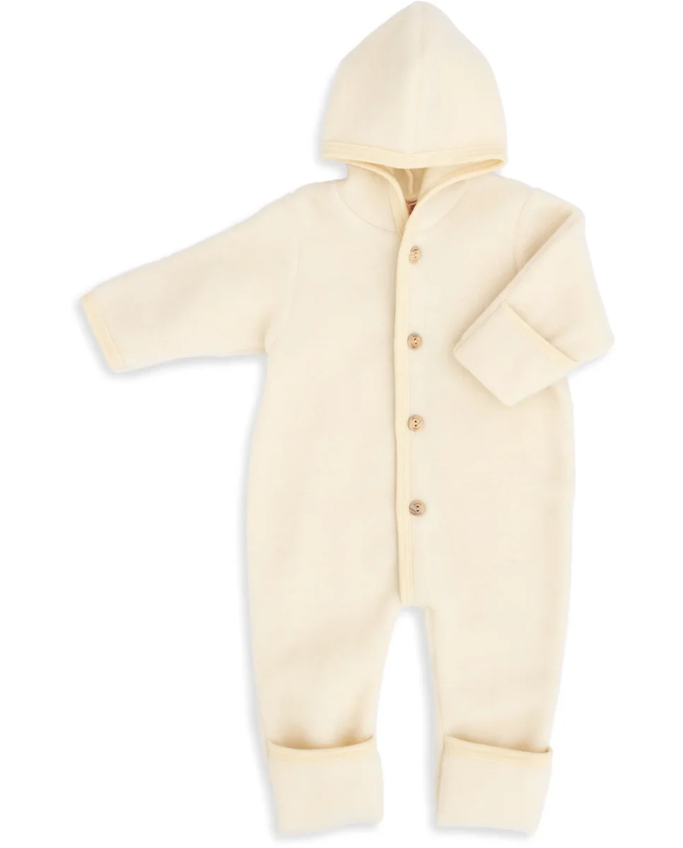 Supermjuk och mysig overall i ljuvlig ullfleece. Med luva och knäppning med träknappar. En riktigt härlig babyoverall som är användbar en stor del av året om man anpassar lagren under overallen. Tillverkad i Tyskland i 100 % ekologisk ull.