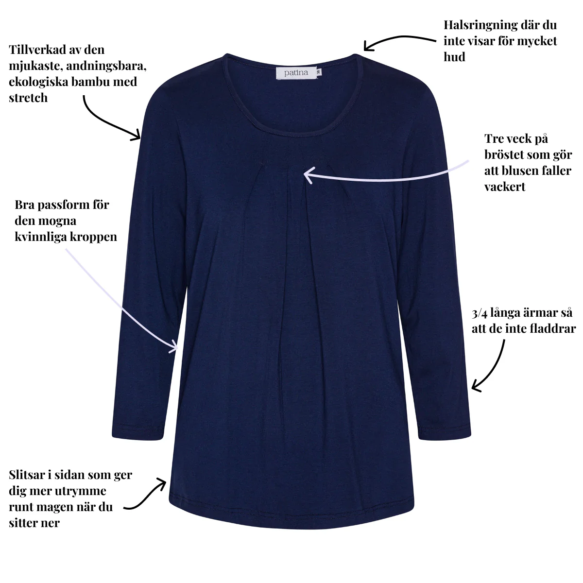 Tyngden i tyget och de tre vecken på bröstet gör att blusen faller fint från din barm och ner i magen. Den har en bantande effekt då blusen inte fastnar på magen.