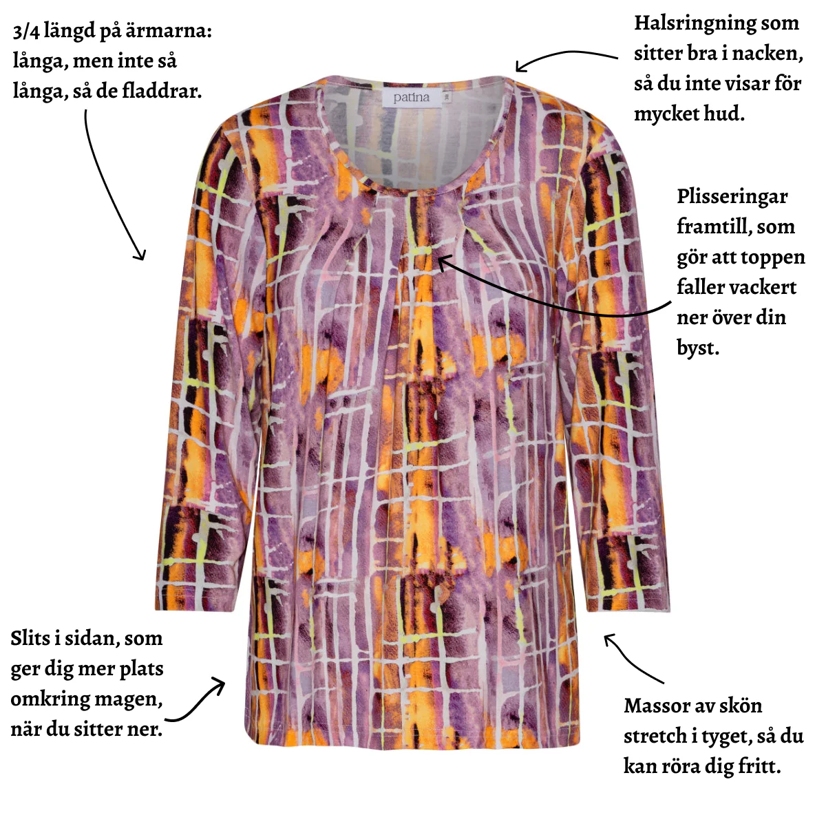 Slitsarna i vardera sida ger dig mer vidd och utrymme runt magen. Det är särskilt bekvämt när du sitter ner. Då upplever du inte att blusen ”stramar” runt magen eftersom slitsarna ger blusen extra vidd.
