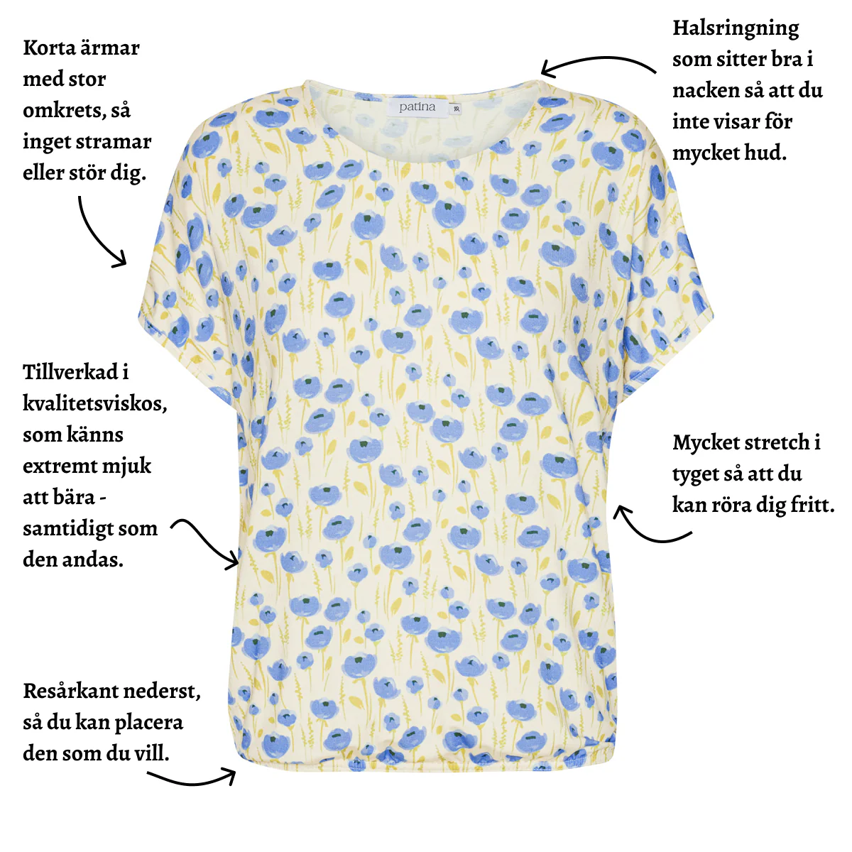 Blusen är tillverkad av 95% viskos och 5% elastan. Elastanet gör att tyget är stretchigt. Då kan du röra dig fritt utan att känna att något stramar eller stör dig.