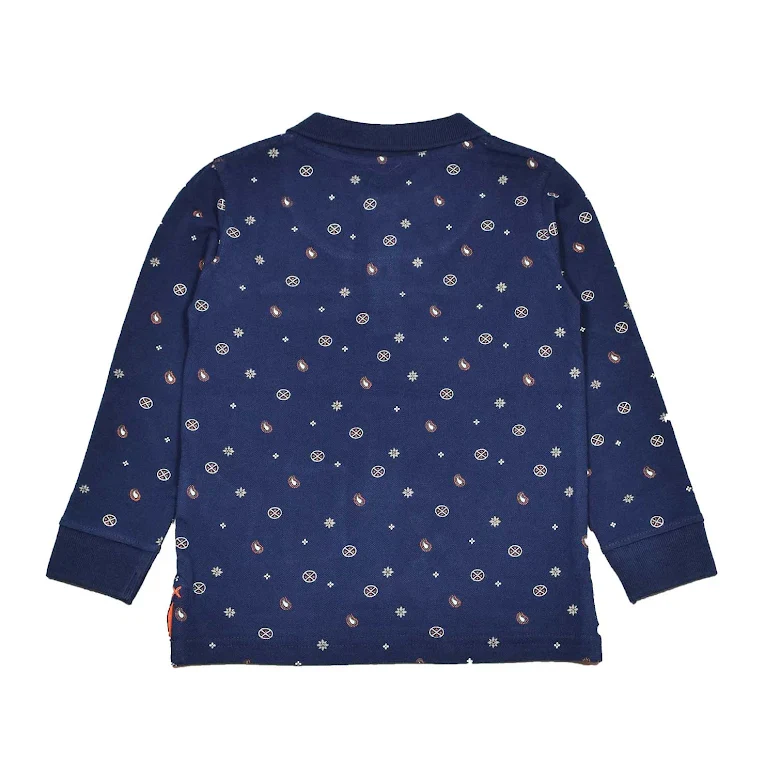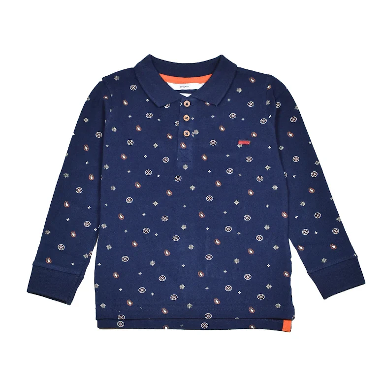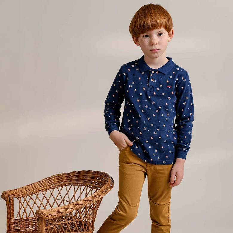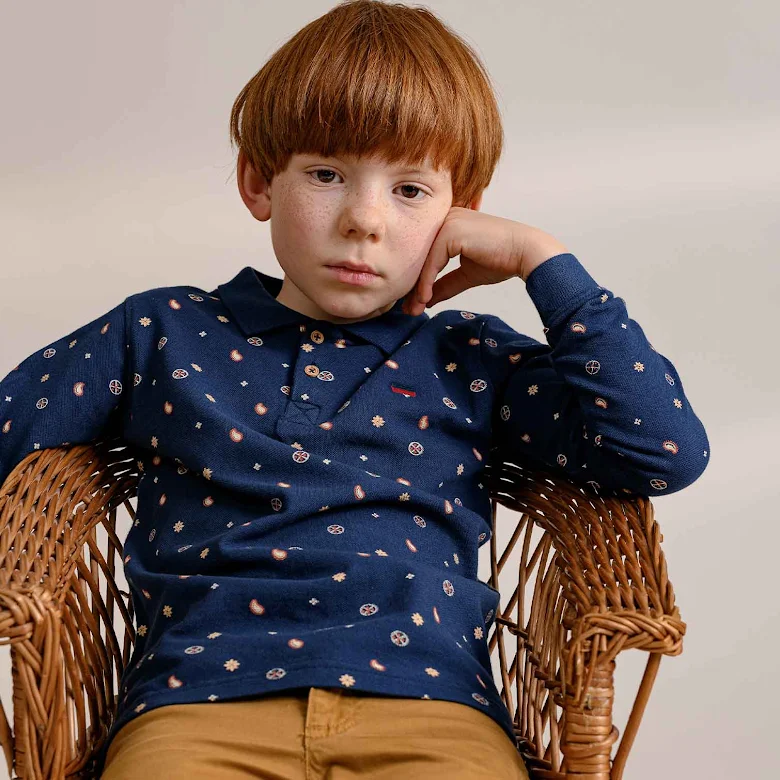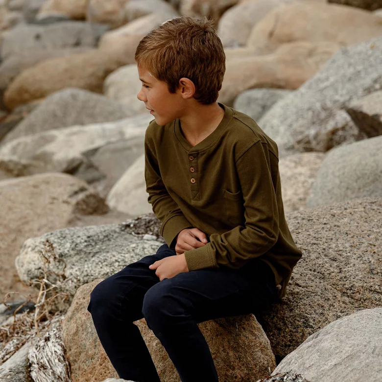 Långärmad piketröja till barn i mjuk, skön ekologisk bomull i sobra färger. Modellen är en farfarströja med tre knappar i träimitaion i fram. Sprund i sidorna.