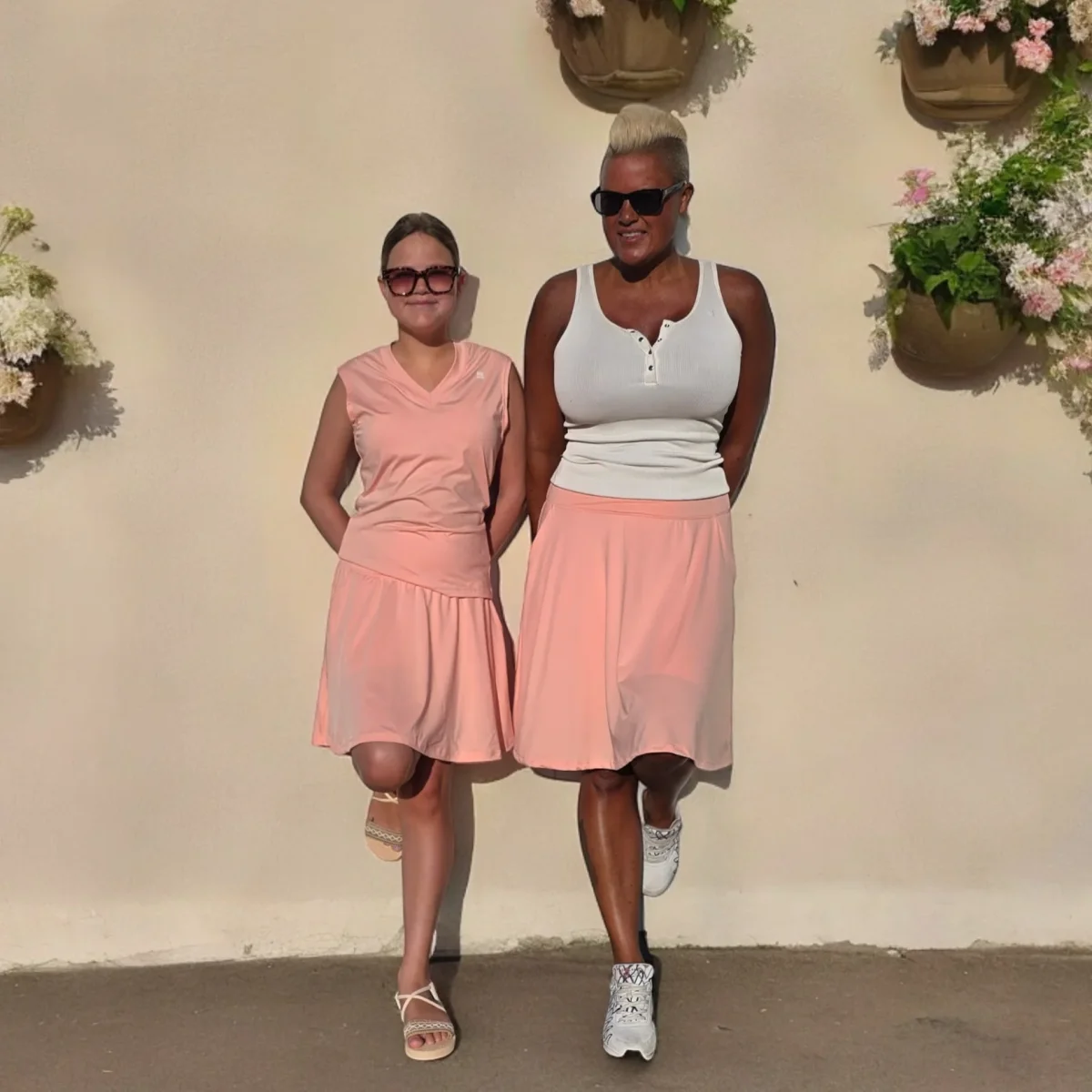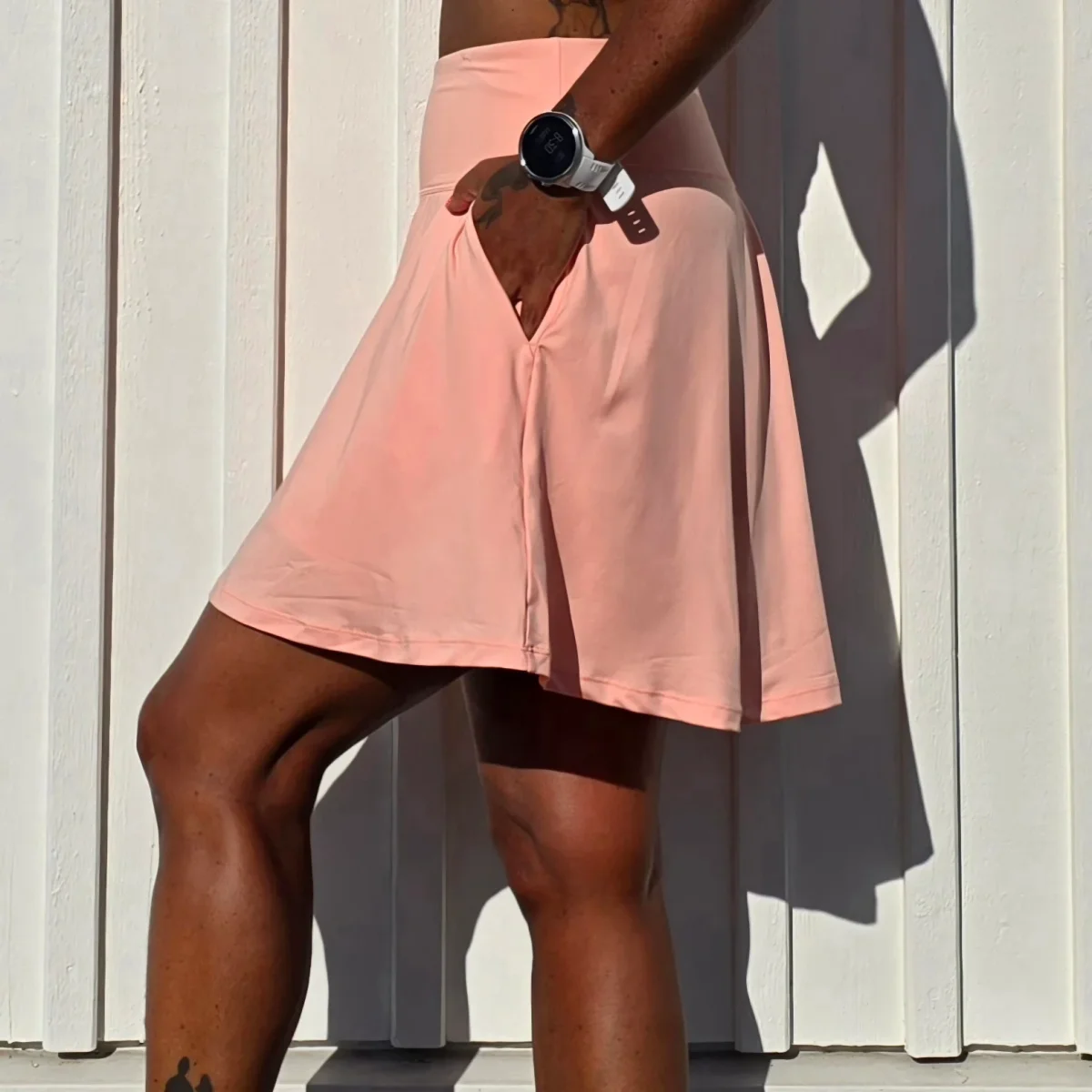 Ljusrosa/aprikos byxkjol i tunnare tyg och fickor utanpå. Innershortsen har två rymliga mobilfickor och två diskreta hållare där du enkelt kan fästa padelbollar, näsduk eller hundpåsar. Ett silikonband hindrar shortsen från att rulla upp när du rör dig. Den passar all aktivitet men är även fin och praktisk till vardag och fest. Hitta din storlek HÄR . OBS! Något större i passformen än våra vanliga smarta byxkjolar.