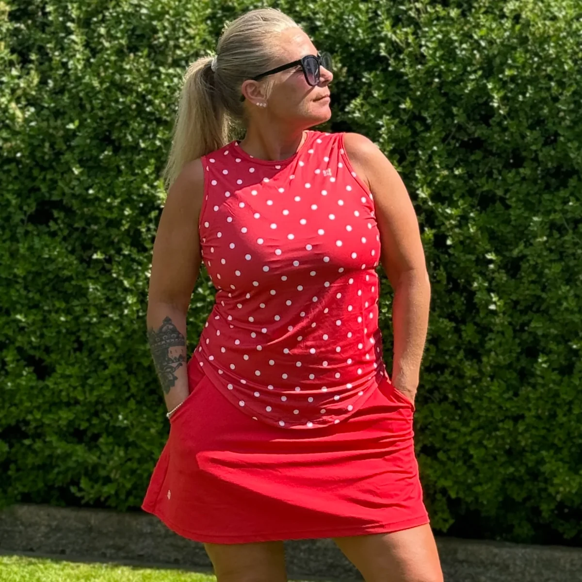 Snyggt linne som passar lika bra till vardags som till träning. Rundad hals och rundad fåll nedtill som gör den snygg att ha utanpå kjolar och byxor. Fin under kavaj. Passformen är ledig, men vill du ha ett mer åtsittande linne kan du gå nedåt i storlek.