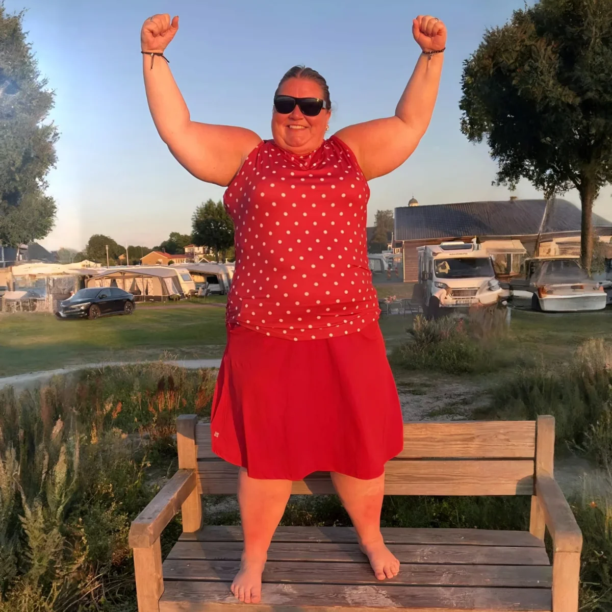En modell är 157 cm lång och en är 175 cm lång. Båda bär storlek M. En modell är 165 cm och bär storlek XL. En modell är 167 cm och bär storlek 5XL.
