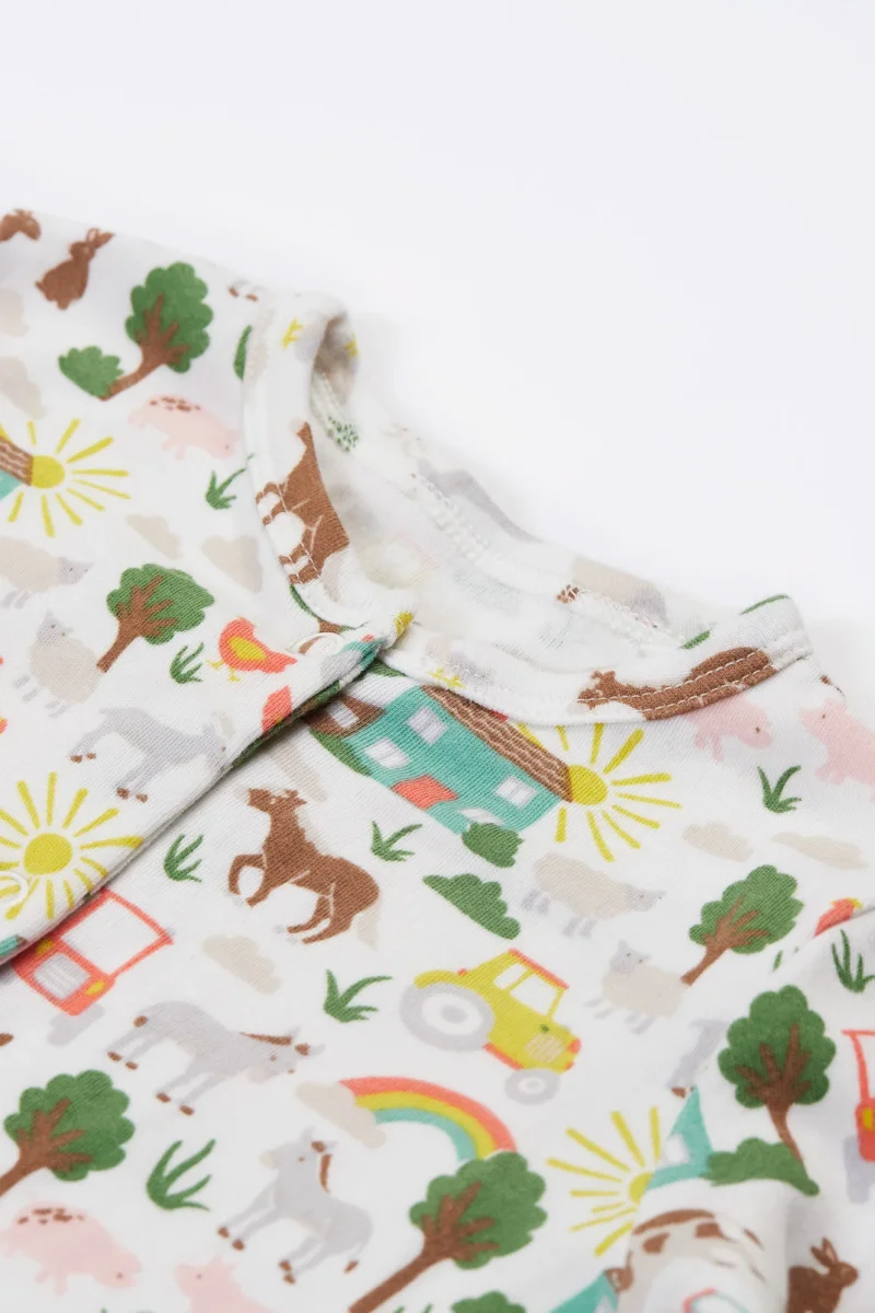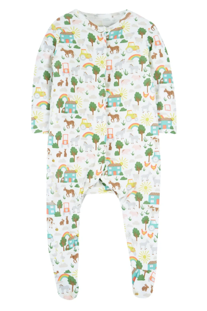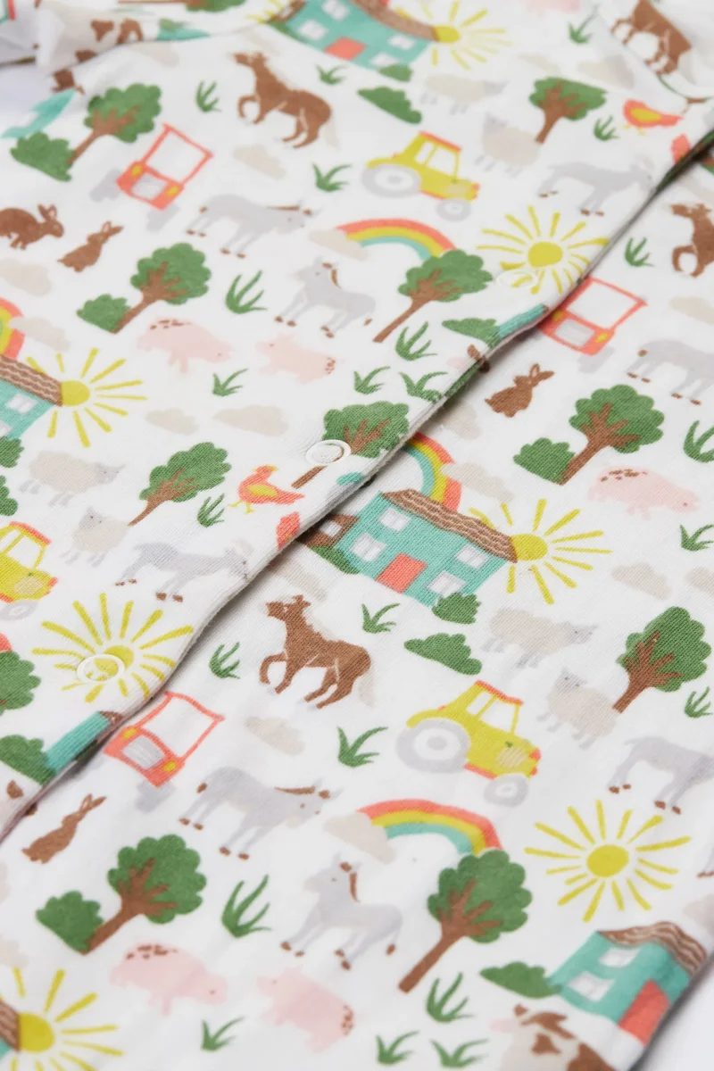 Söt babypyjamas från Frugi i underbart mjuk bomull med sött tryck med bondgårdsdjur. Pyjamasen har flera små detaljer som gör den mycket praktisk. Den knäpps med tryckknappar ner på båda benen för att underlätta på- och avklädning. Storlekar upp till 74/80 har nedvikbara muddar som fungerar som integrerade vantar och håller bebisens händer varma och förhindrar att de råkar riva sig. Pyjamasen har också fötter i dubbelt tyg för att hålla fötterna varma och för ökad slitstyrka.