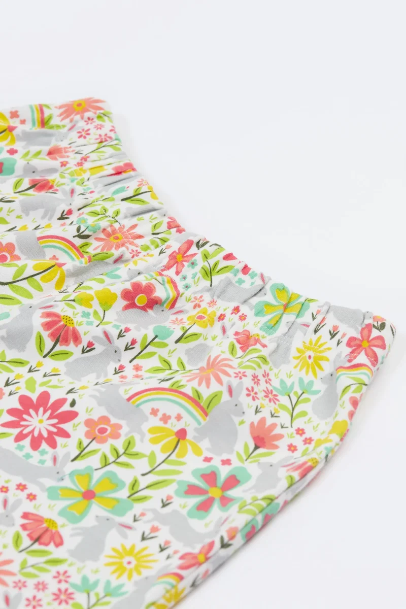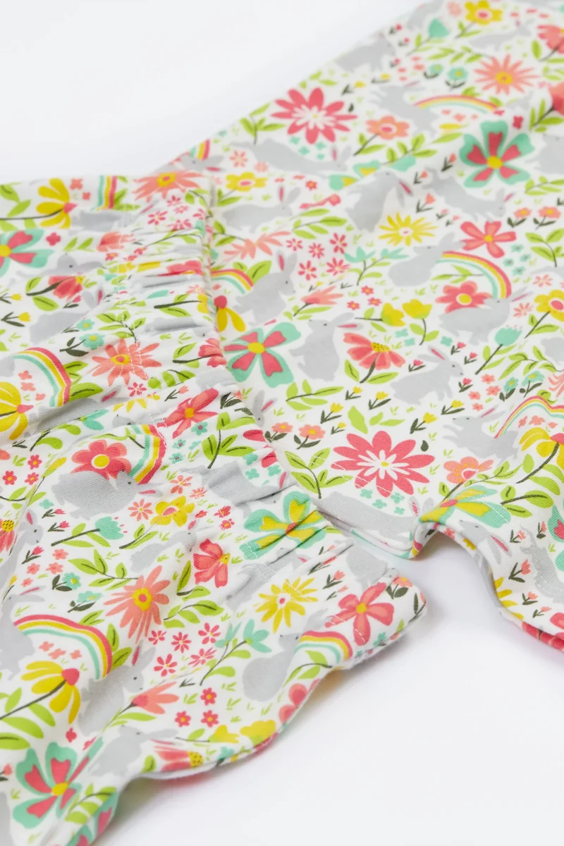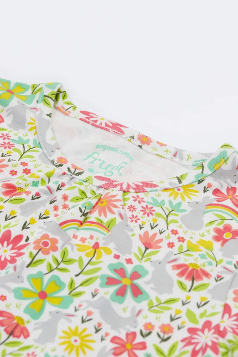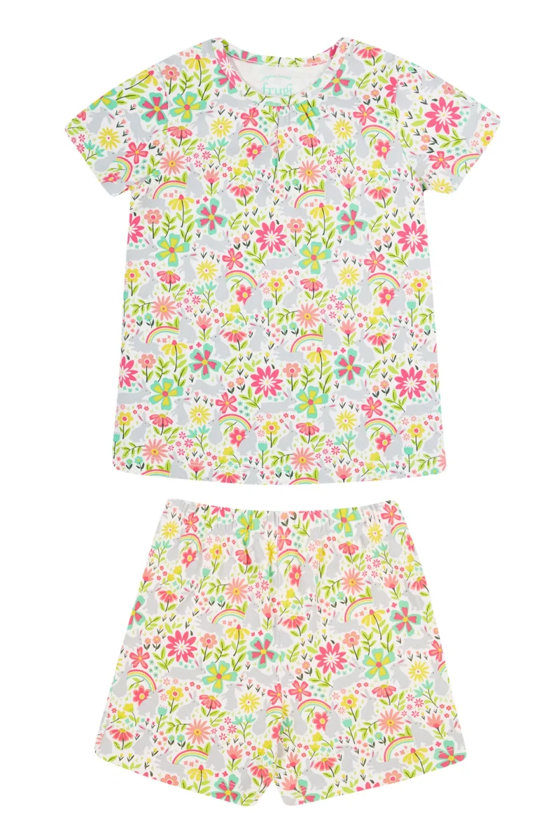 Ljuvlig kortärmad pyjamas för barn från Frugi i mjuk bomullstrikå med blommönster. Rynkor mot halskant och resår i midjan. Storlekar upp till 98/104 har tryckknappar på ena axeln.