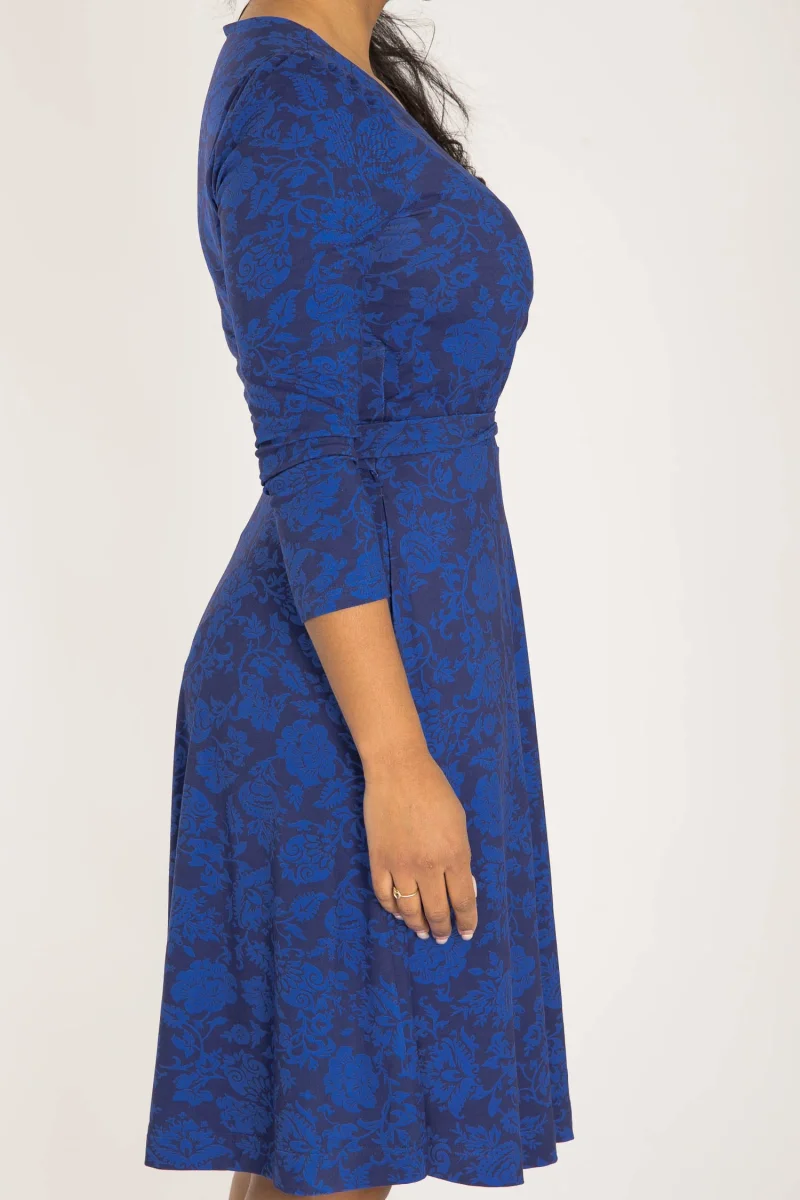 Voila! Här är vår klänningsmodell Ready to go – en knälång trikåklänning som förenar stil och komfort. Det klarblå blommönstret mot marinblå botten ger en frisk och livfull touch till din garderob.