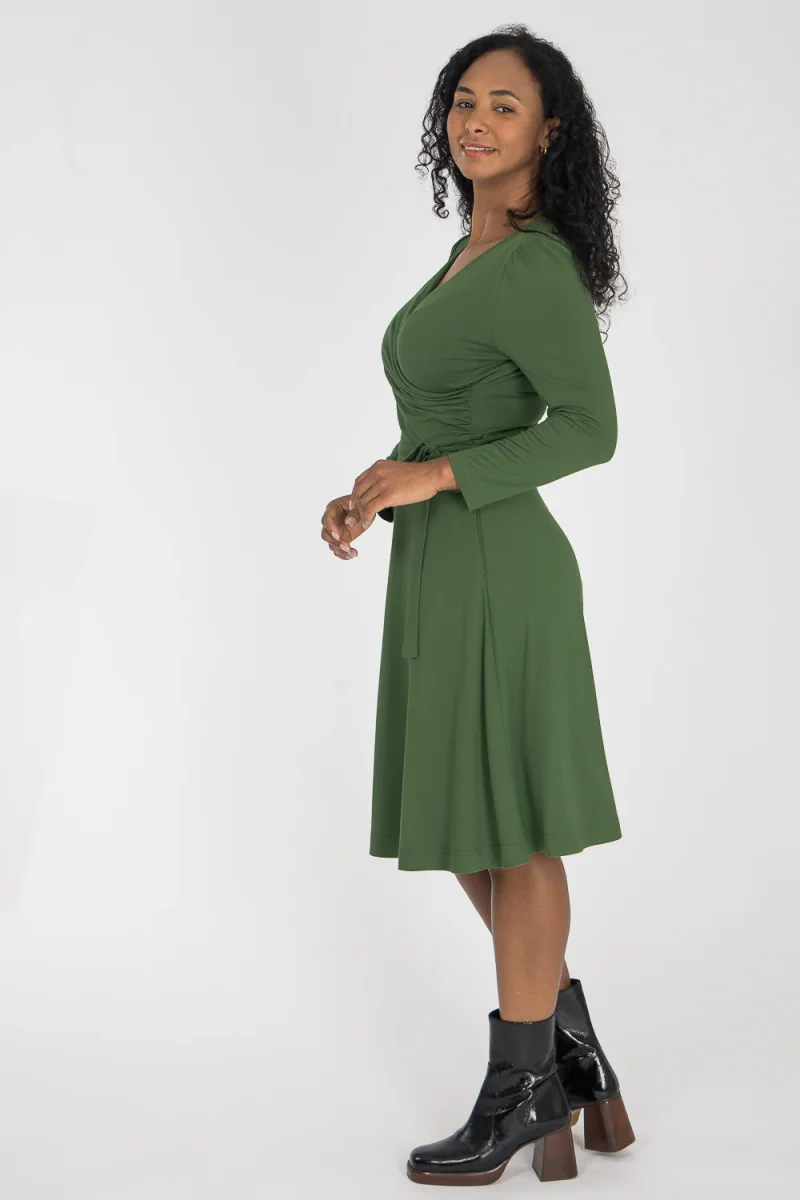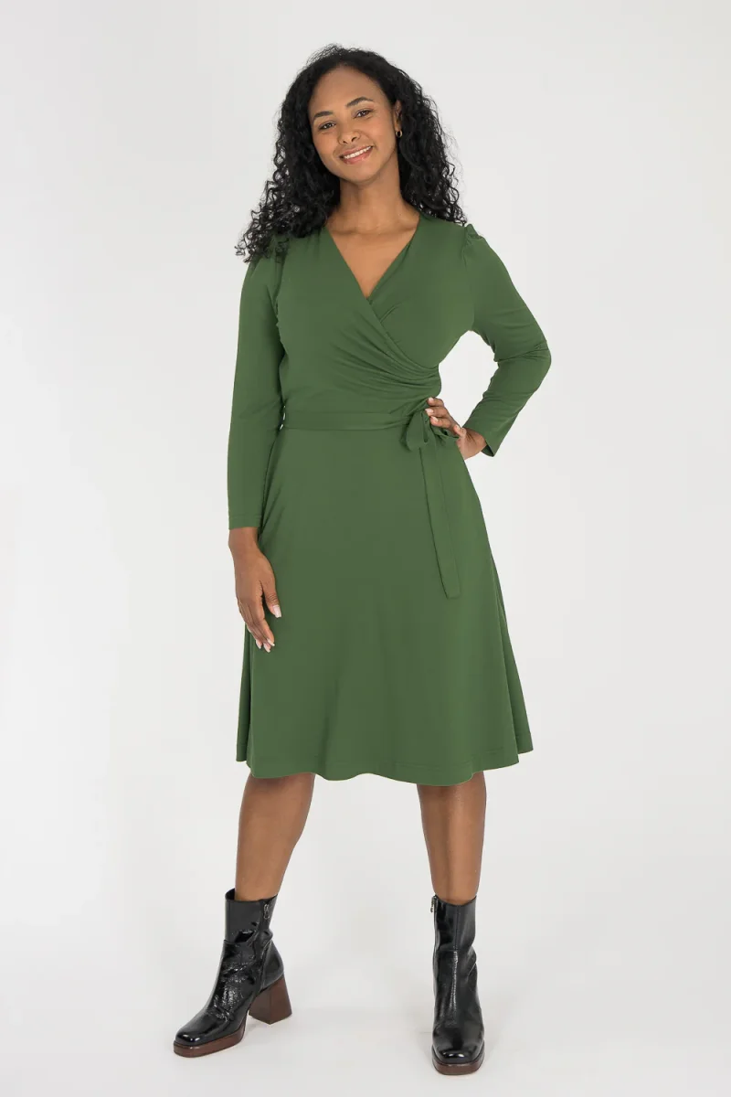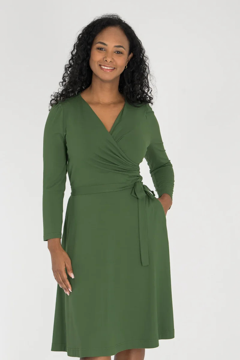 Ready to go – en knälång trikåklänning som kombinerar komfort med genomtänkta detaljer. Omlottlivet med drapering i sidan och de ¾-långa ärmarna med rynk vid axeln skapar en feminin helhet. Den utställda kjolen faller fint, och det fastsydda knytbandet i midjan kan knytas både fram och bak för att variera stilen. Sidfickor gör klänningen både praktisk och bekväm.