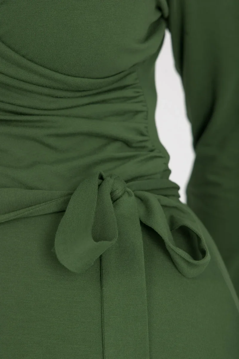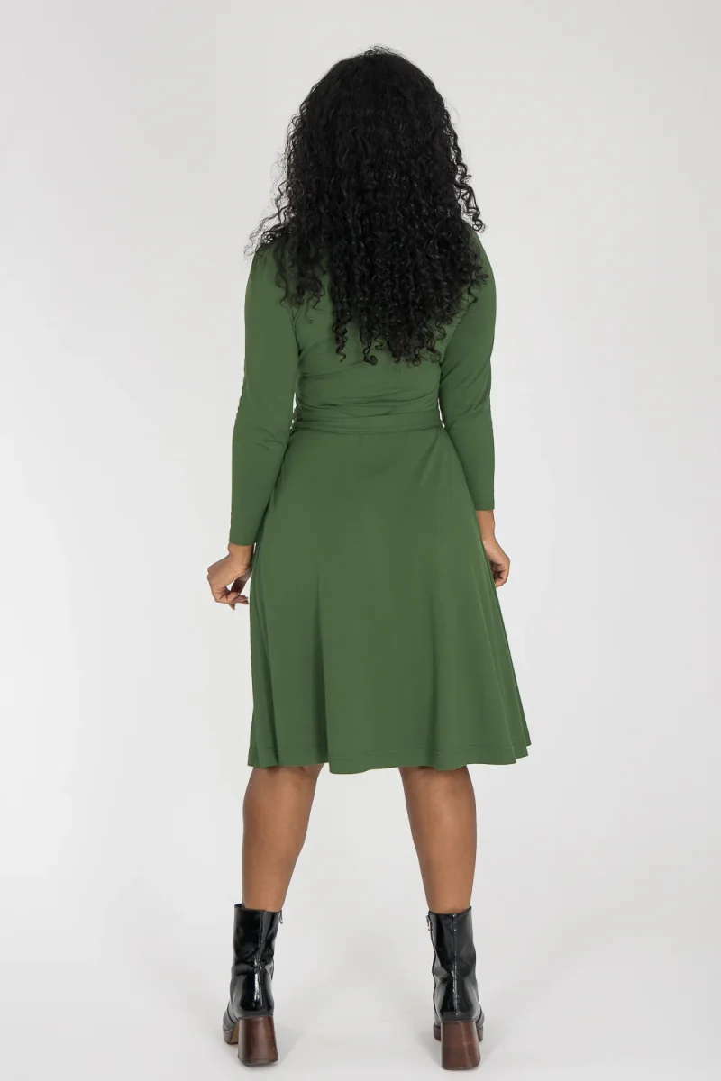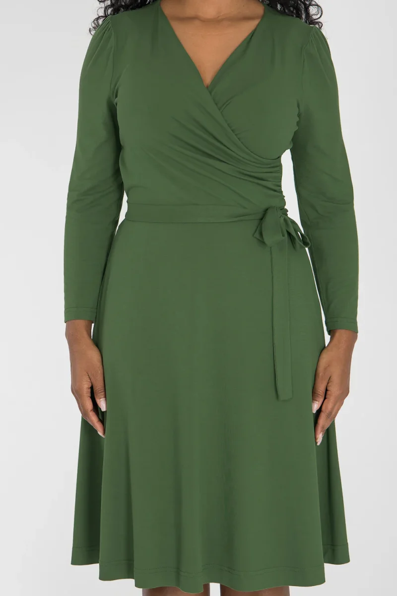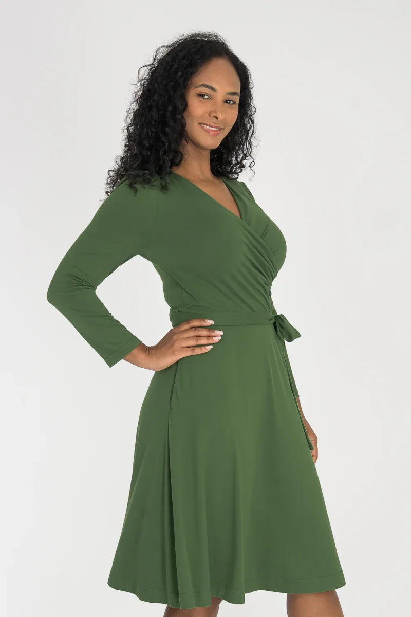 Ready to go – en knälång trikåklänning som kombinerar komfort med genomtänkta detaljer. Omlottlivet med drapering i sidan och de ¾-långa ärmarna med rynk vid axeln skapar en feminin helhet. Den utställda kjolen faller fint, och det fastsydda knytbandet i midjan kan knytas både fram och bak för att variera stilen. Sidfickor gör klänningen både praktisk och bekväm.