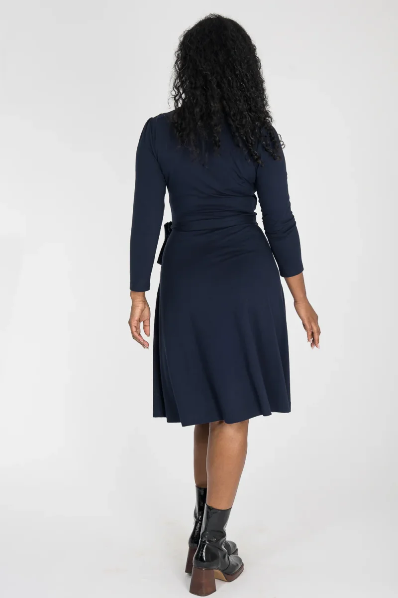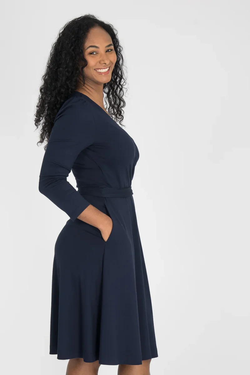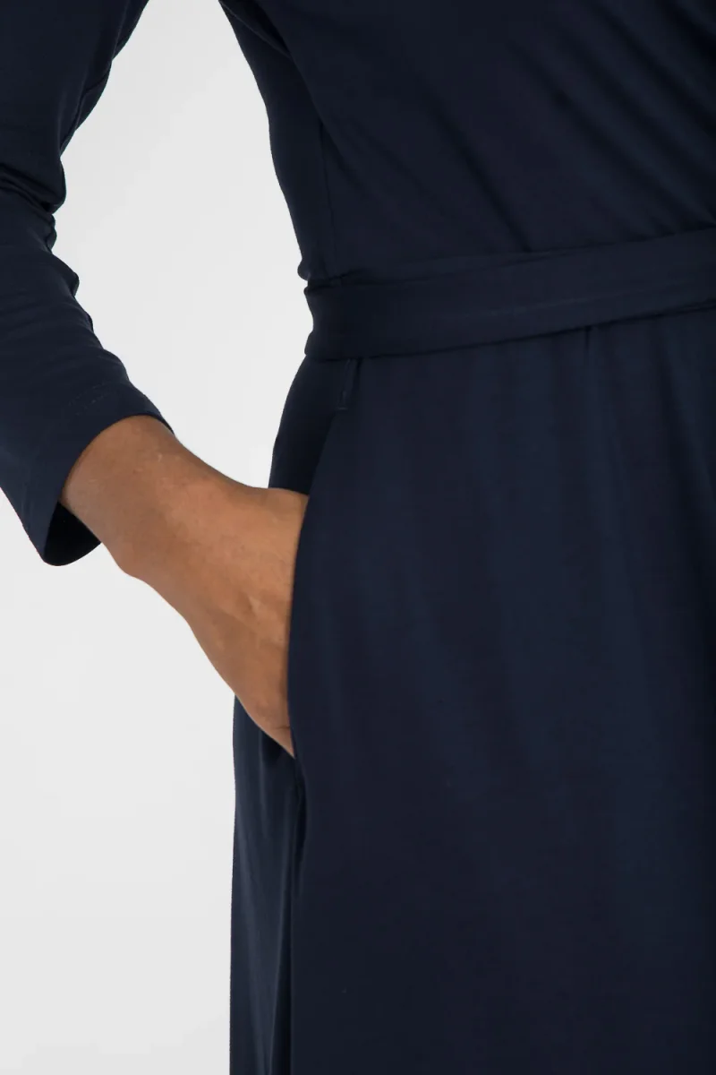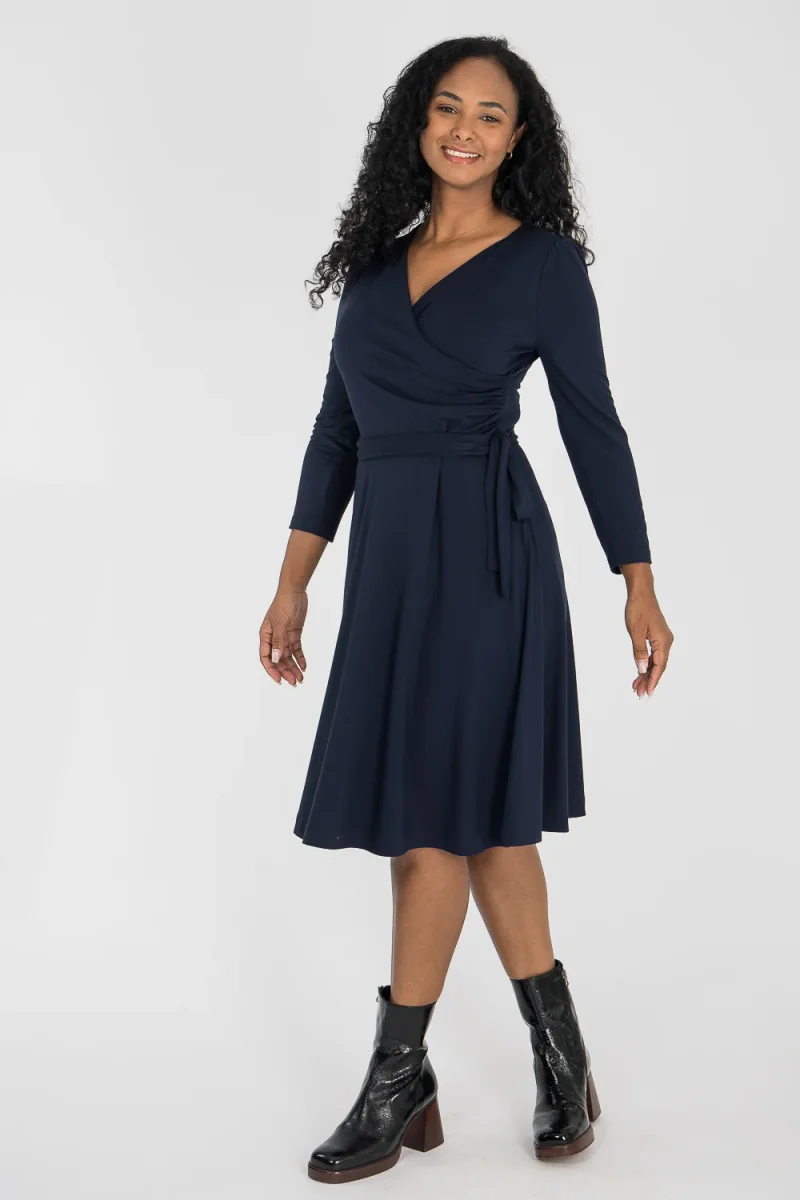 Ready to go – en knälång trikåklänning som kombinerar komfort med genomtänkta detaljer. Omlottlivet med drapering i sidan och de ¾-långa ärmarna med rynk vid axeln skapar en feminin helhet. Den utställda kjolen faller fint, och det fastsydda knytbandet i midjan kan knytas både fram och bak för att variera stilen. Sidfickor gör klänningen både praktisk och bekväm.