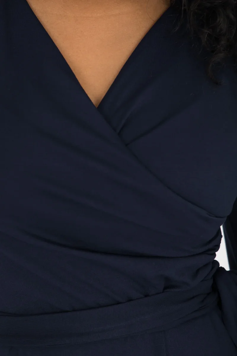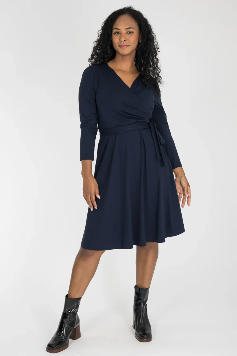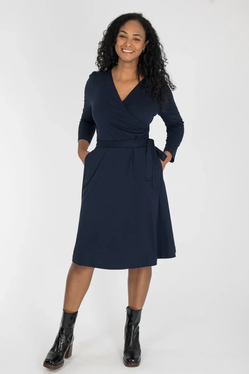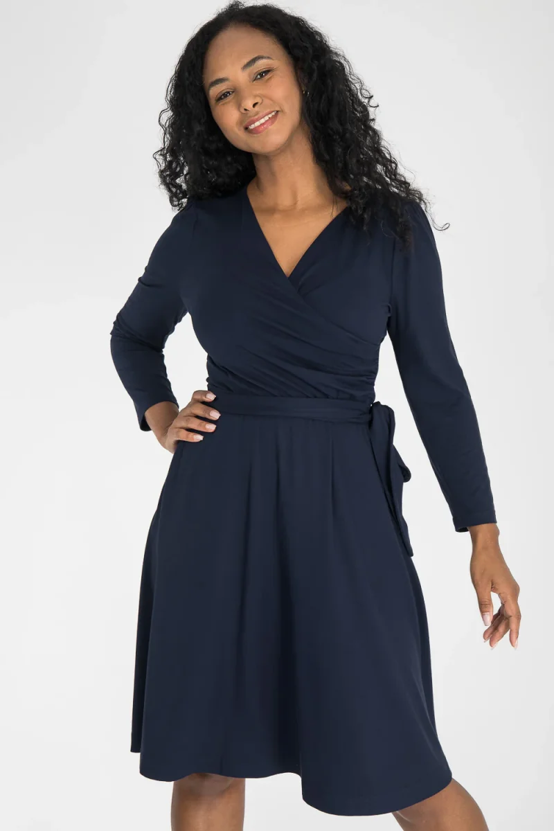 Ready to go – en knälång trikåklänning som kombinerar komfort med genomtänkta detaljer. Omlottlivet med drapering i sidan och de ¾-långa ärmarna med rynk vid axeln skapar en feminin helhet. Den utställda kjolen faller fint, och det fastsydda knytbandet i midjan kan knytas både fram och bak för att variera stilen. Sidfickor gör klänningen både praktisk och bekväm.