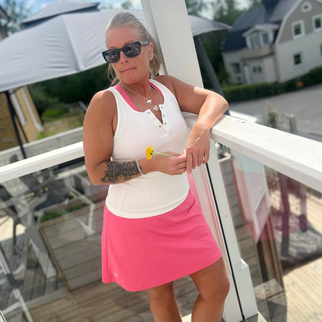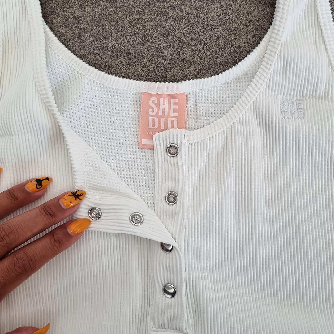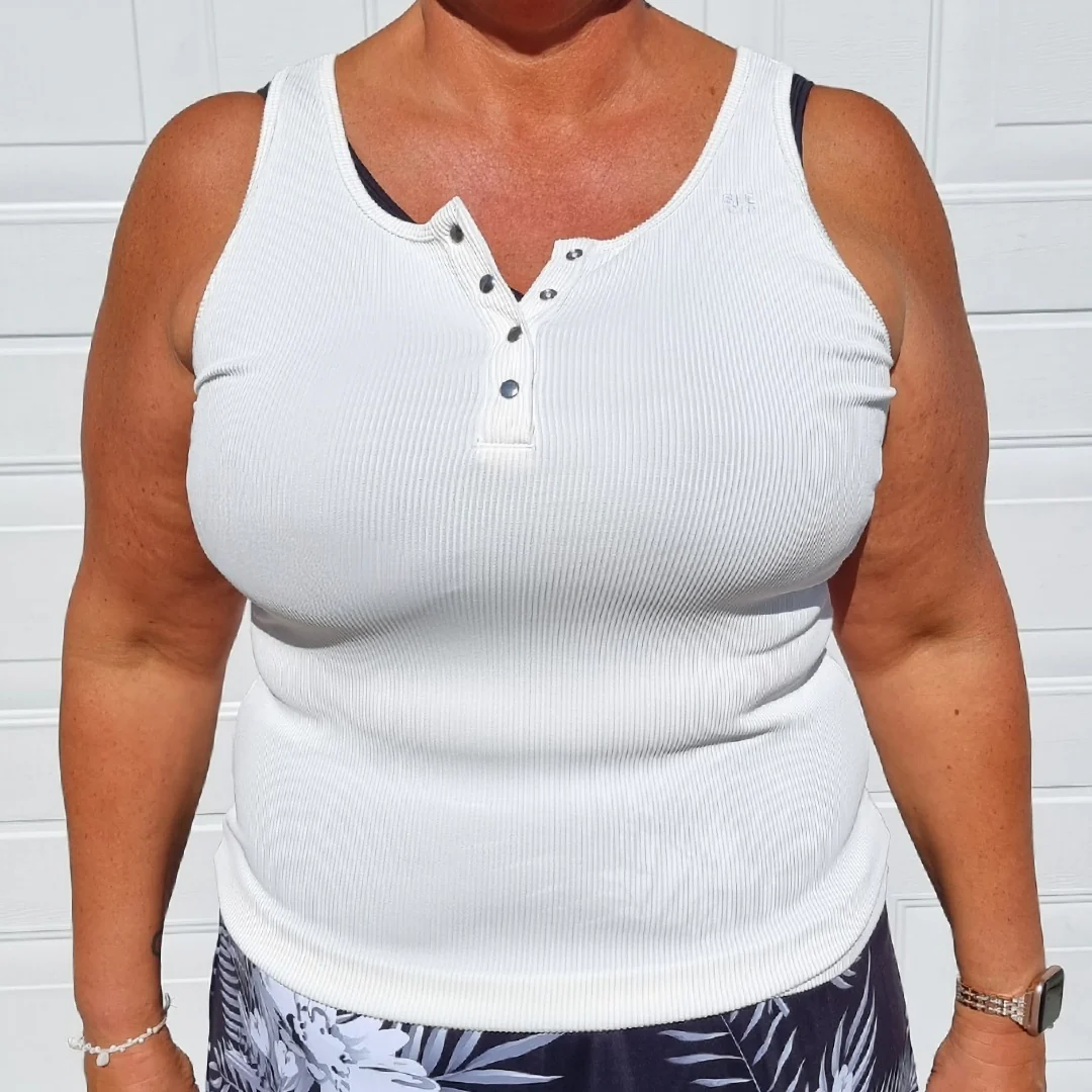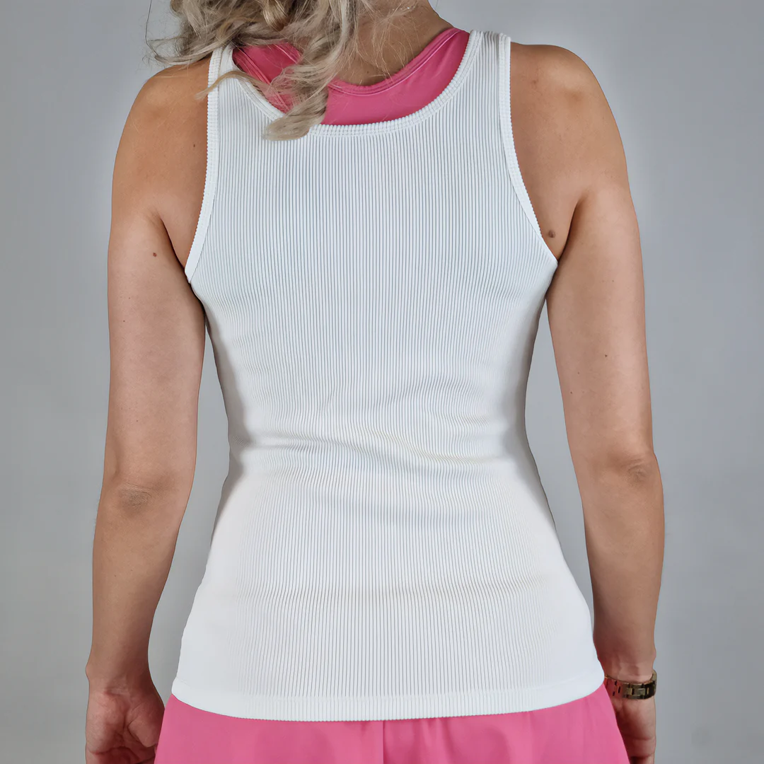Vitt linne i snyggt elastiskt ribbat tyg med knäppning fram. Skapat för all sorts träning och sport, men lika fint till vardags som det är eller under kavaj.