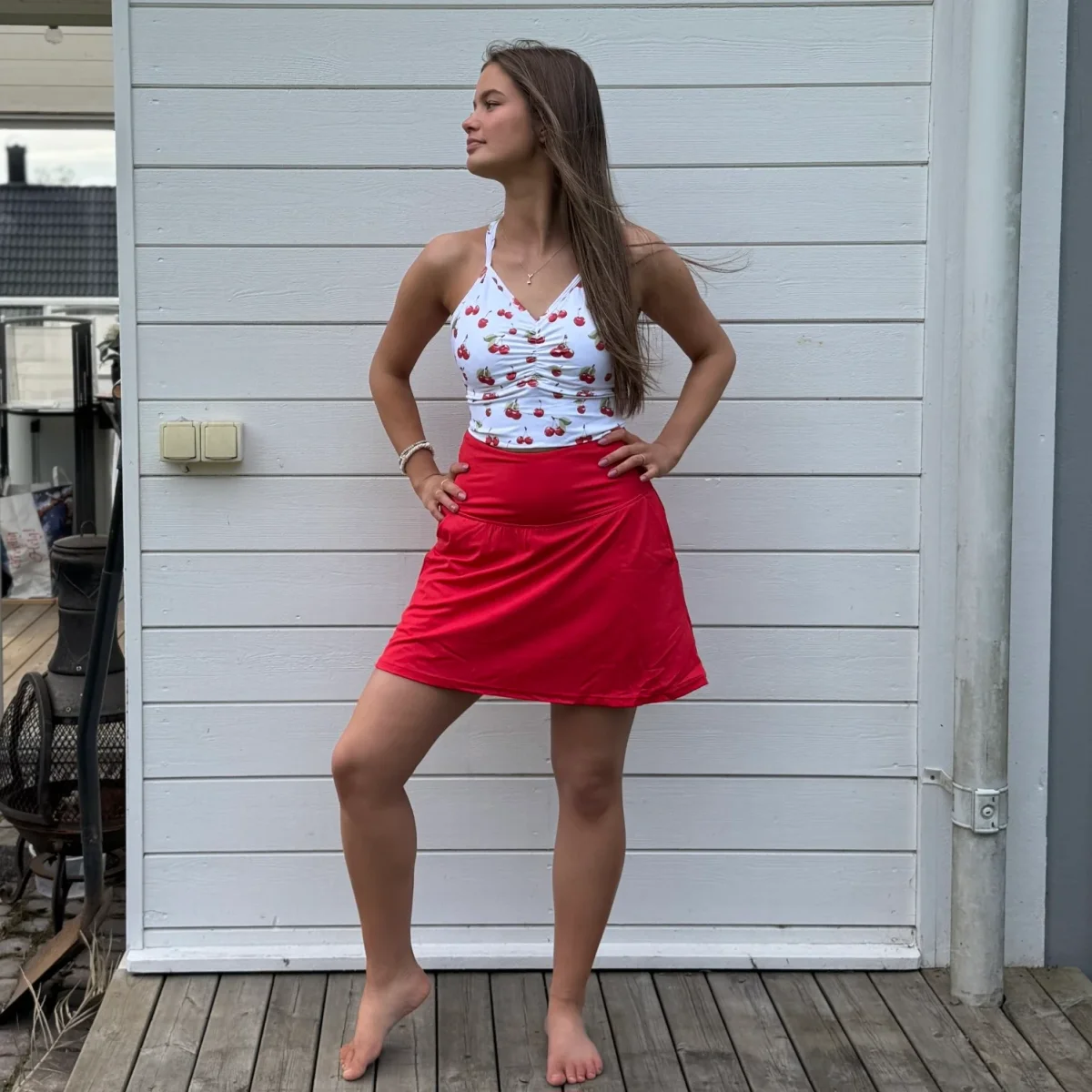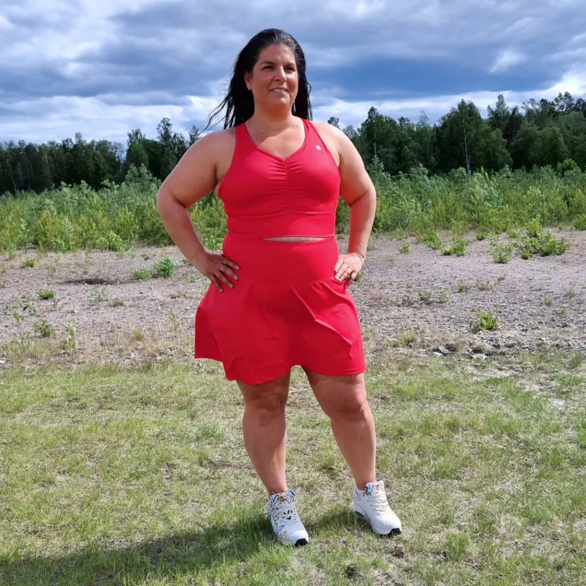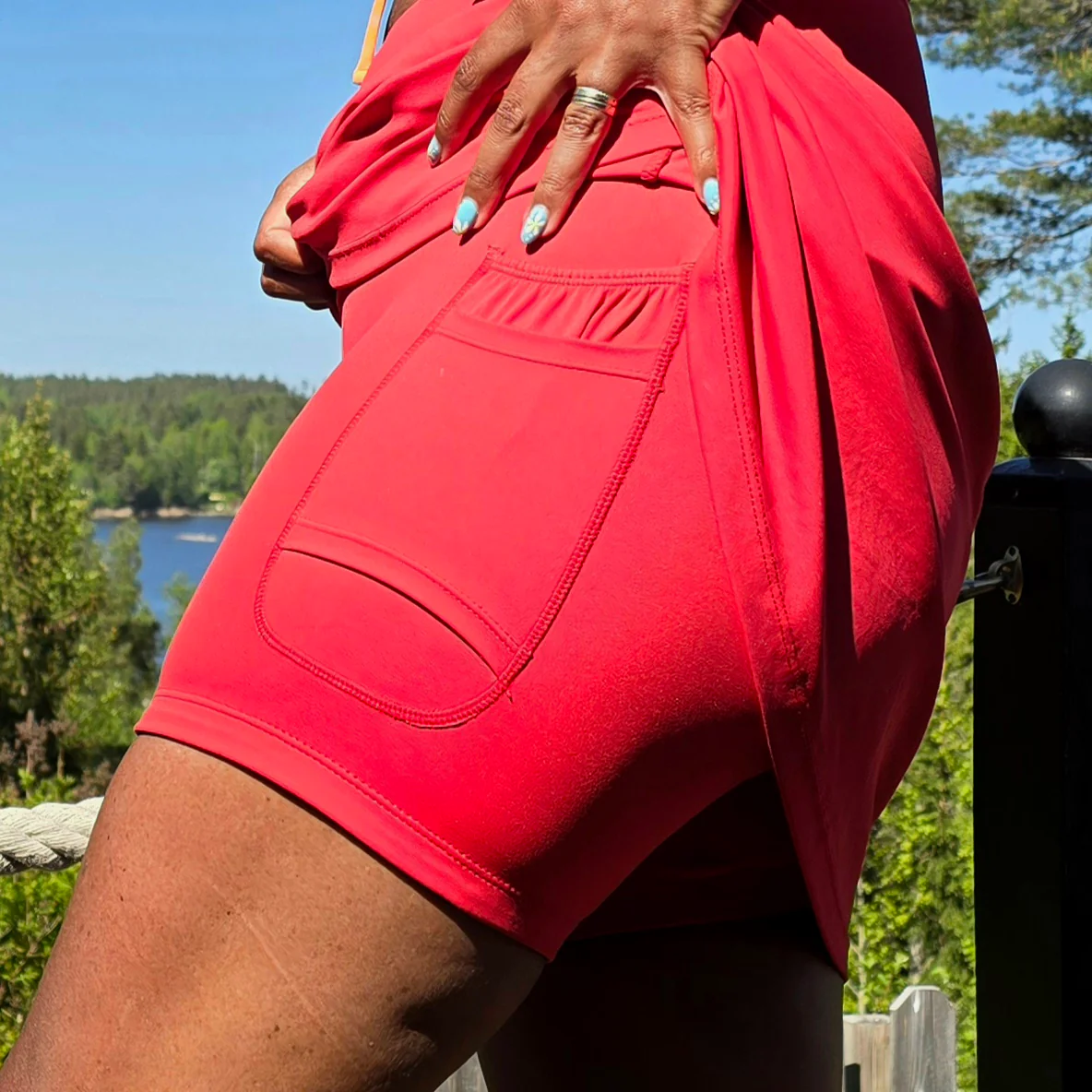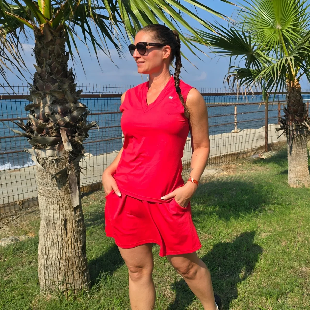Röd byxkjol med fickor utanpå. Innershortsen har två rymliga mobilfickor och två diskreta hållare där du enkelt kan fästa padelbollar, näsduk eller hundpåsar. Ett silikonband hindrar shortsen från att rulla upp när du rör dig. Den passar all aktivitet men är även fin och praktisk till vardag och fest. Passformen och tyget är densamma som våra smarta byxkjolar. Hitta din storlek HÄR .