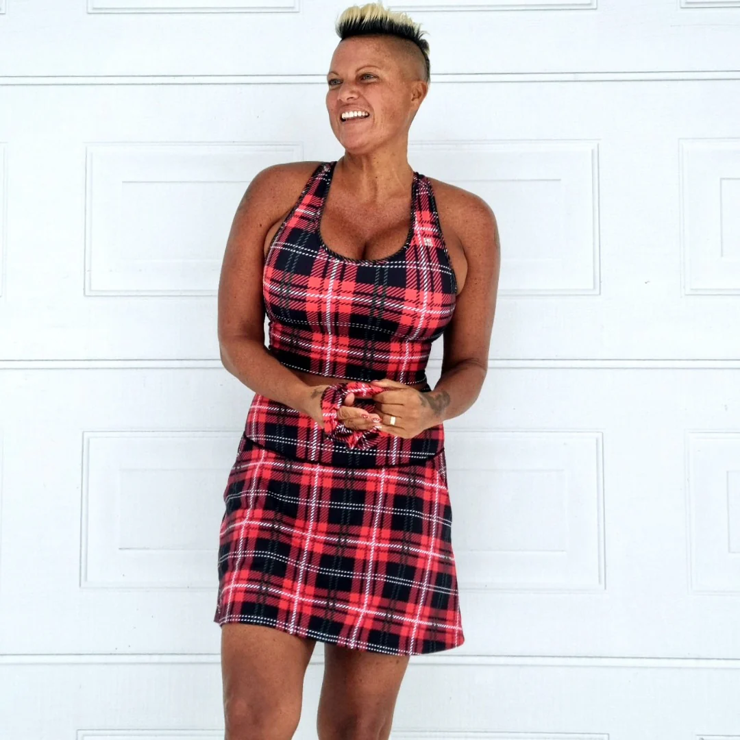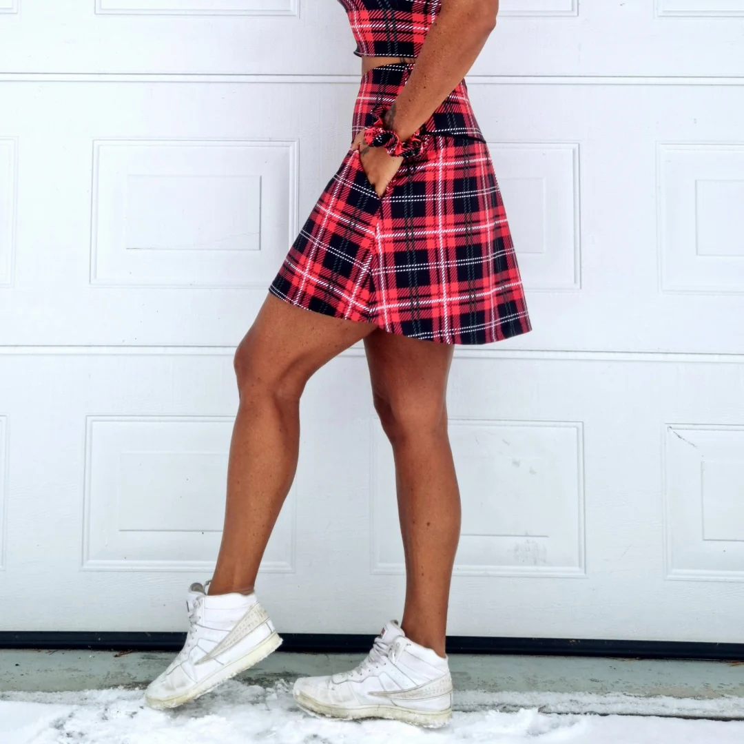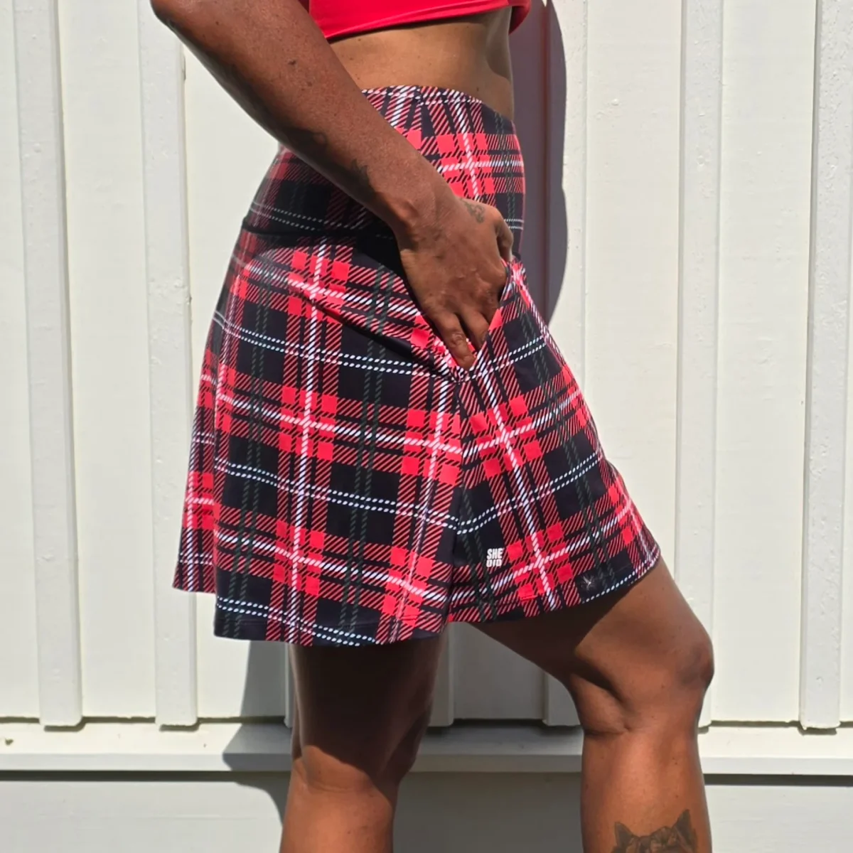 Rödrutig smart byxkjol med fickor utanpå. Innershortsen har två rymliga mobilfickor och två diskreta hållare där du enkelt kan fästa padelbollar, näsduk eller hundpåsar. Ett silikonband hindrar shortsen från att rulla upp när du rör dig. Den passar all aktivitet men är även fin och praktisk till vardag och fest. Passformen och tyget är densamma som våra smarta byxkjolar. Hitta din storlek