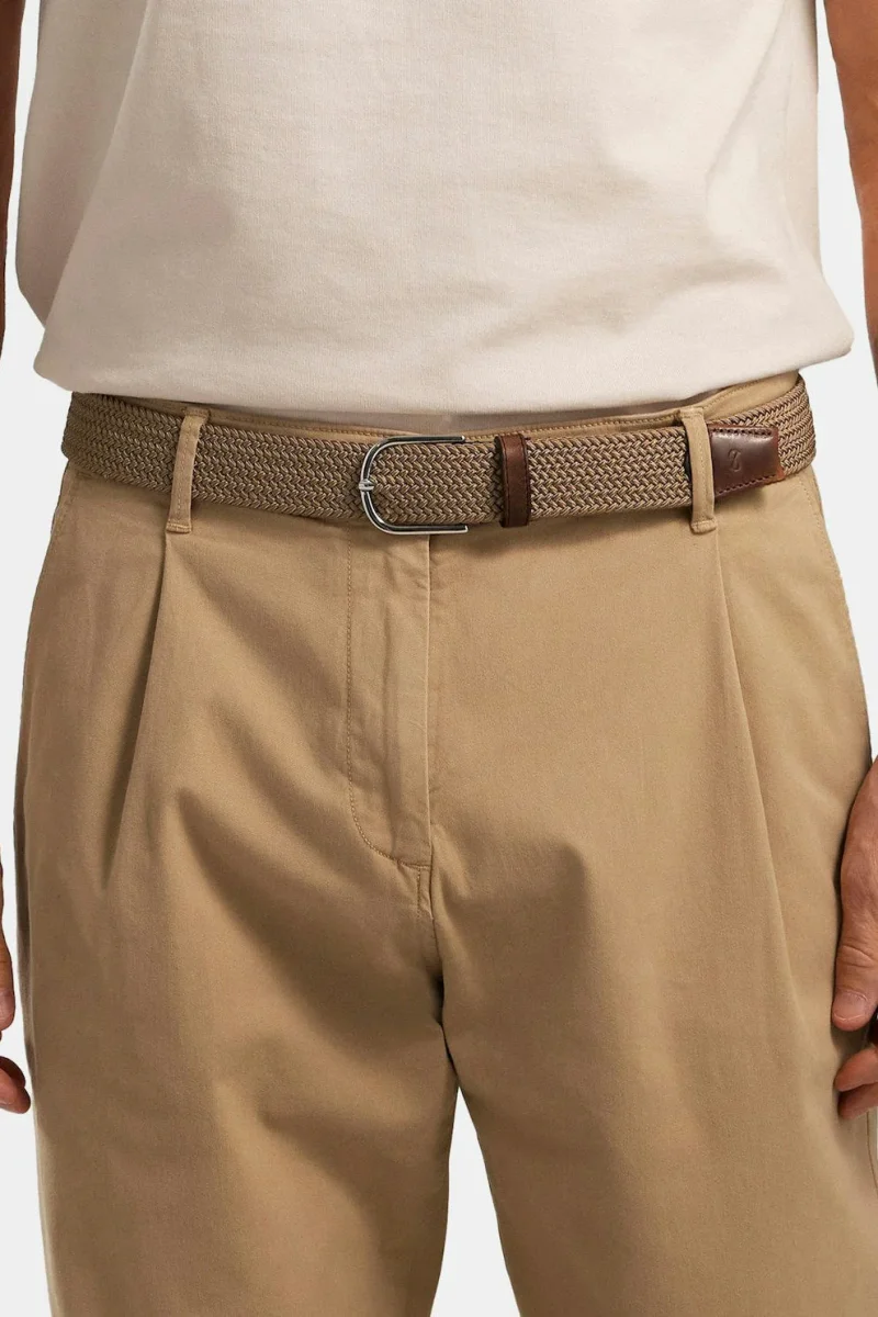 Högkvalitativt bälte från Saddler. Bältet är av mycket hög kvalitet, med flätad struktur och brunt läder i ändarna. Den flätade strukturen ger bältet stretchfunktion. Bältet har ett stort bältesspänne i blank metall. Bredd: 3,5 cm.