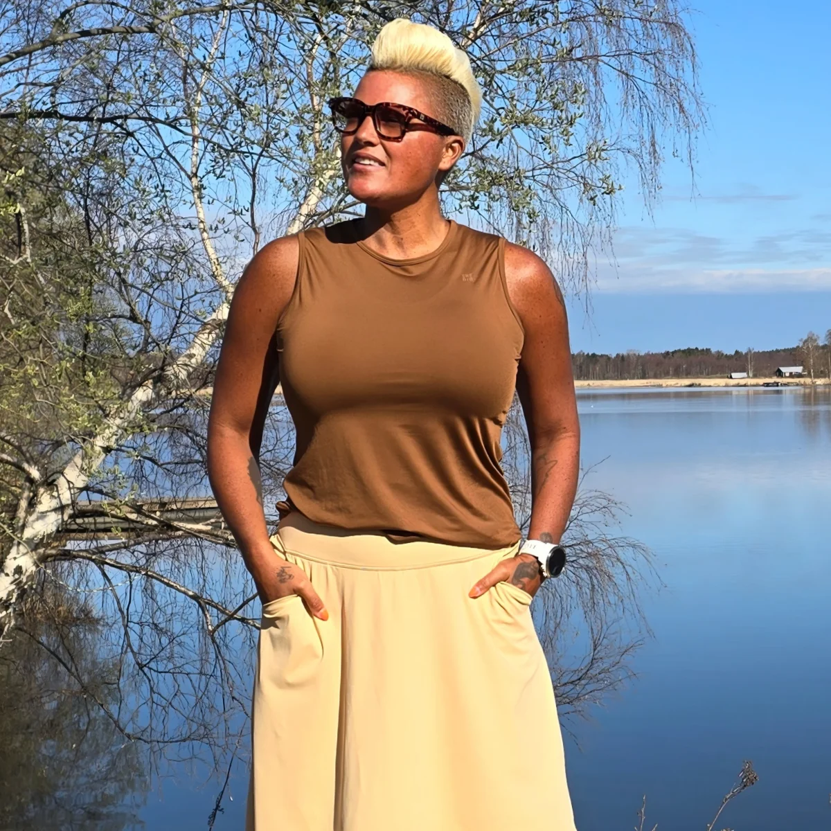 Snyggt linne som passar lika bra till vardags som till träning. Rundad hals och rundad fåll nedtill som gör den snygg att ha utanpå kjolar och byxor. Fin under kavaj. Passformen är ledig, men vill du ha ett mer åtsittande linne kan du gå nedåt i storlek.