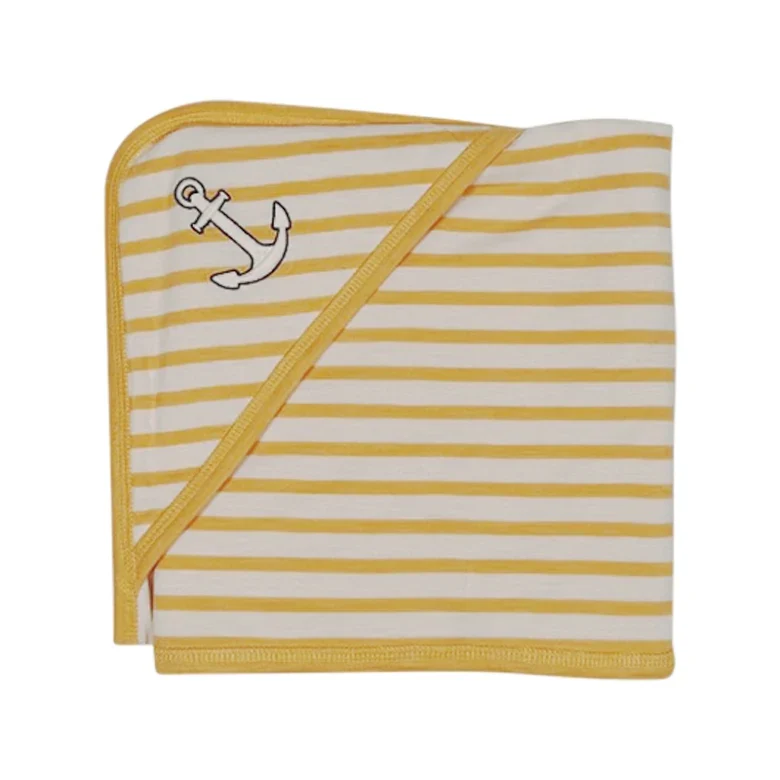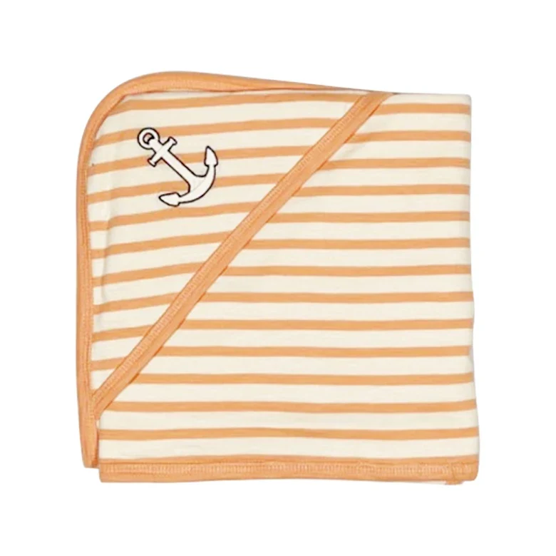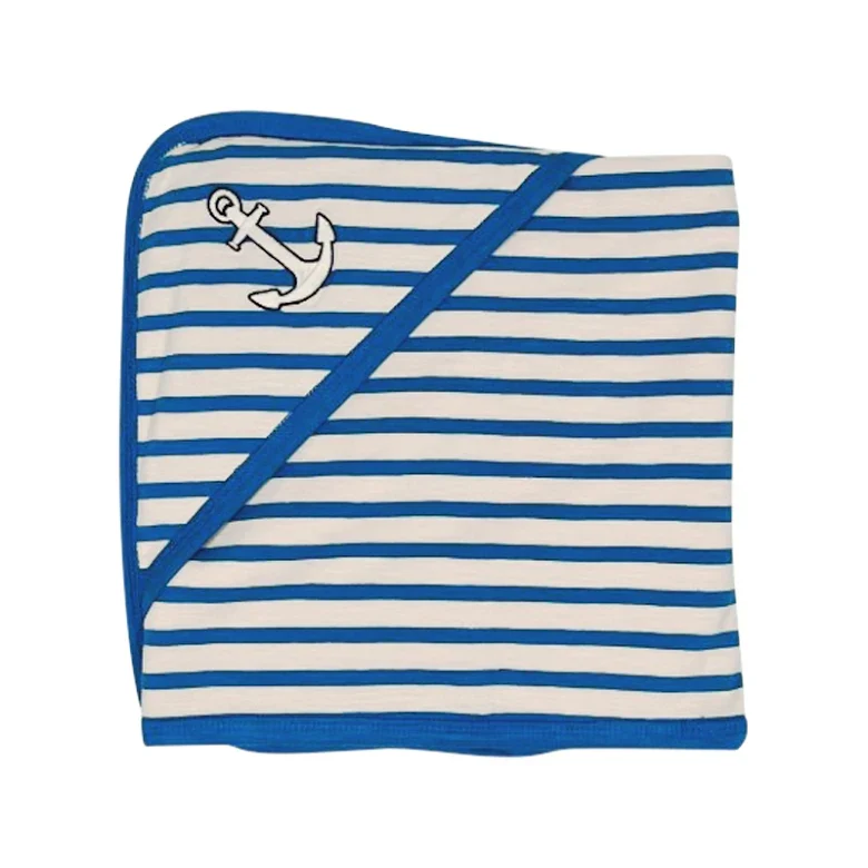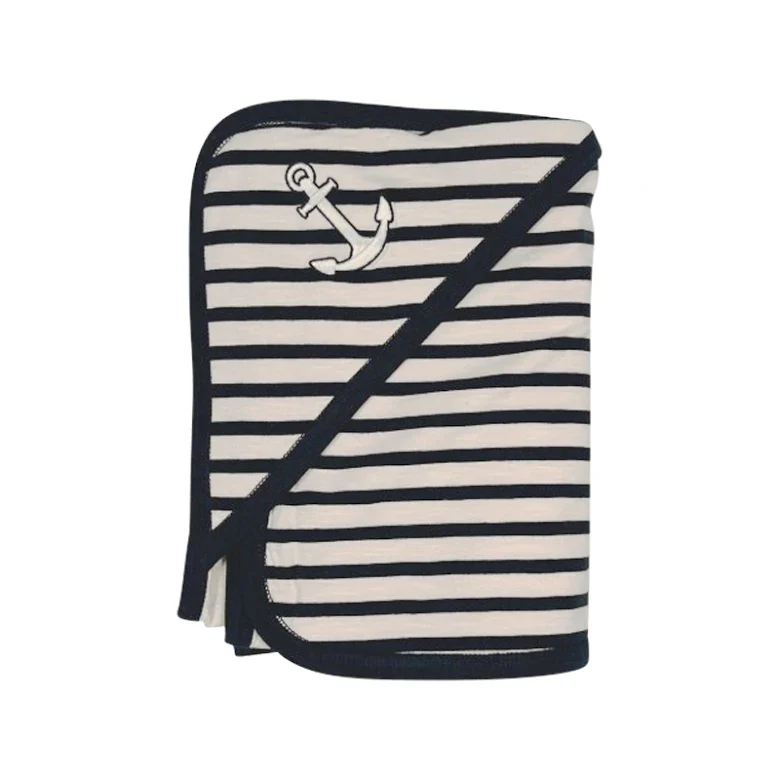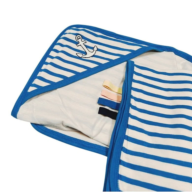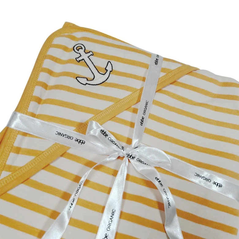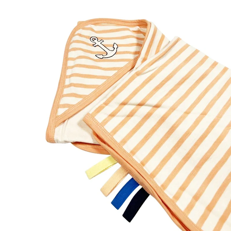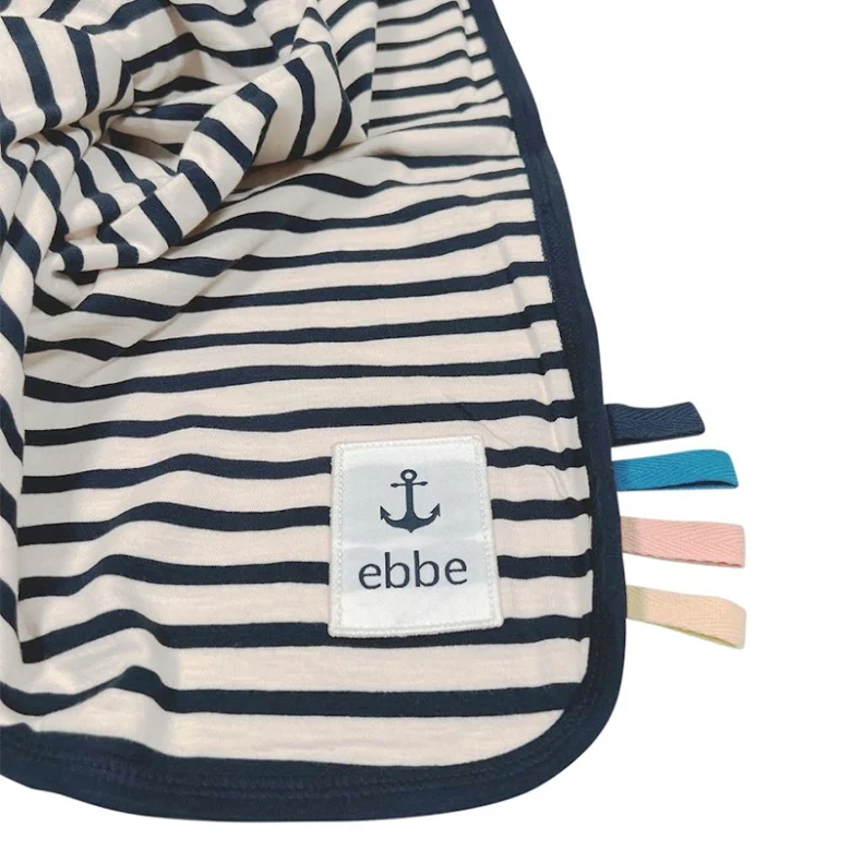 Mjuk bebisfilt med en mysig ”hood”. Små taktilband som bebisen kan pilla och titta på. Filten är i dubbelt tyg men randig utsida och enfärgad insida. Storlek: 80*80 cm.