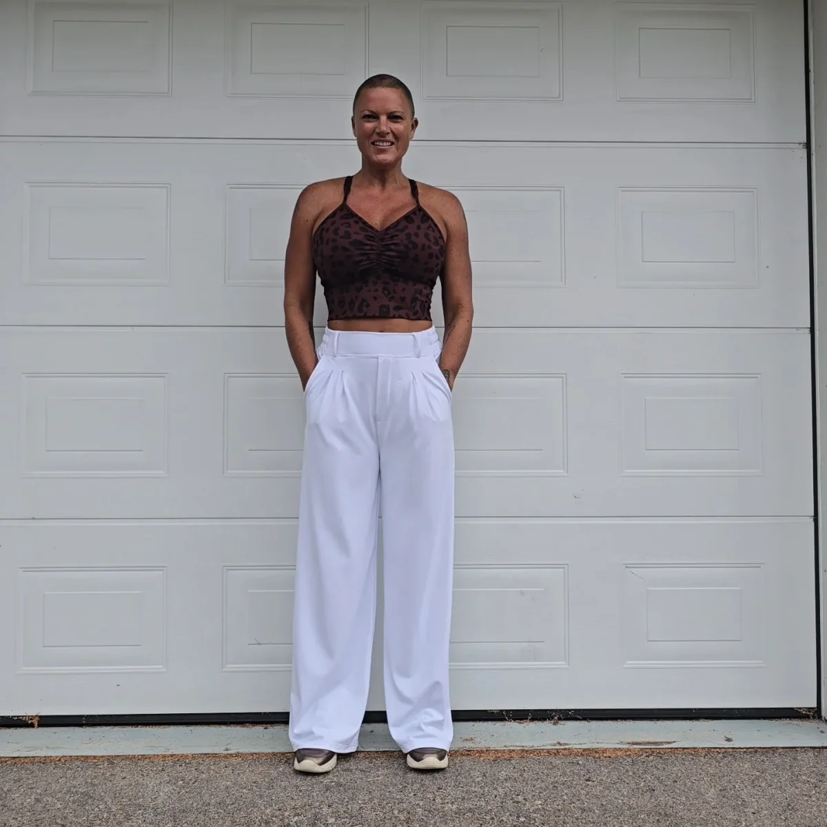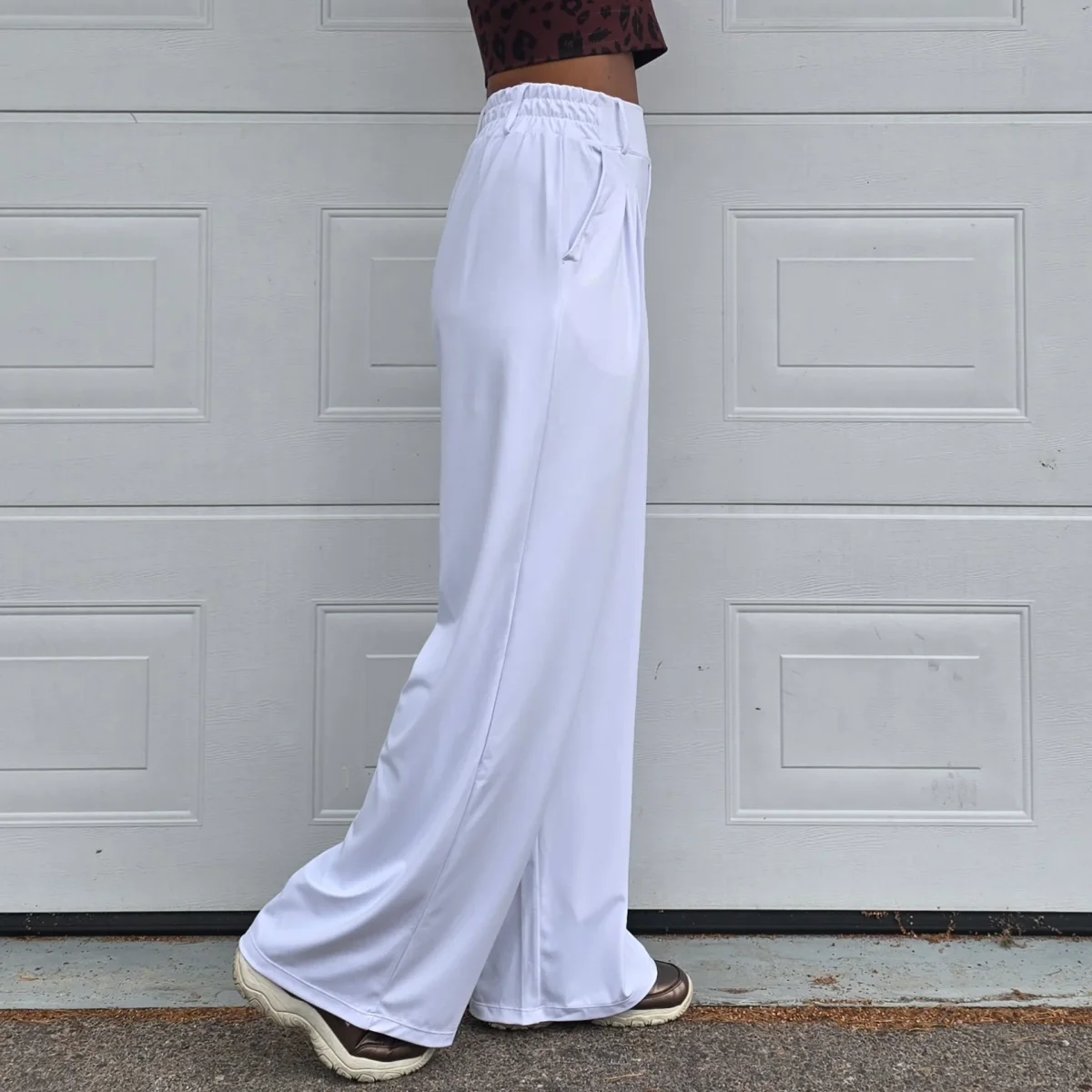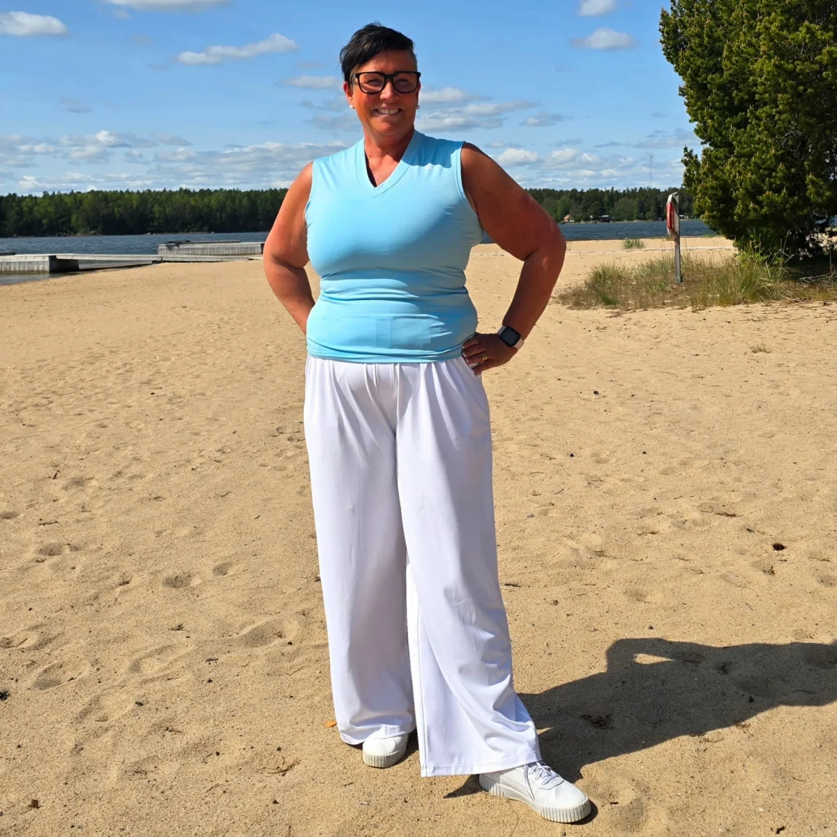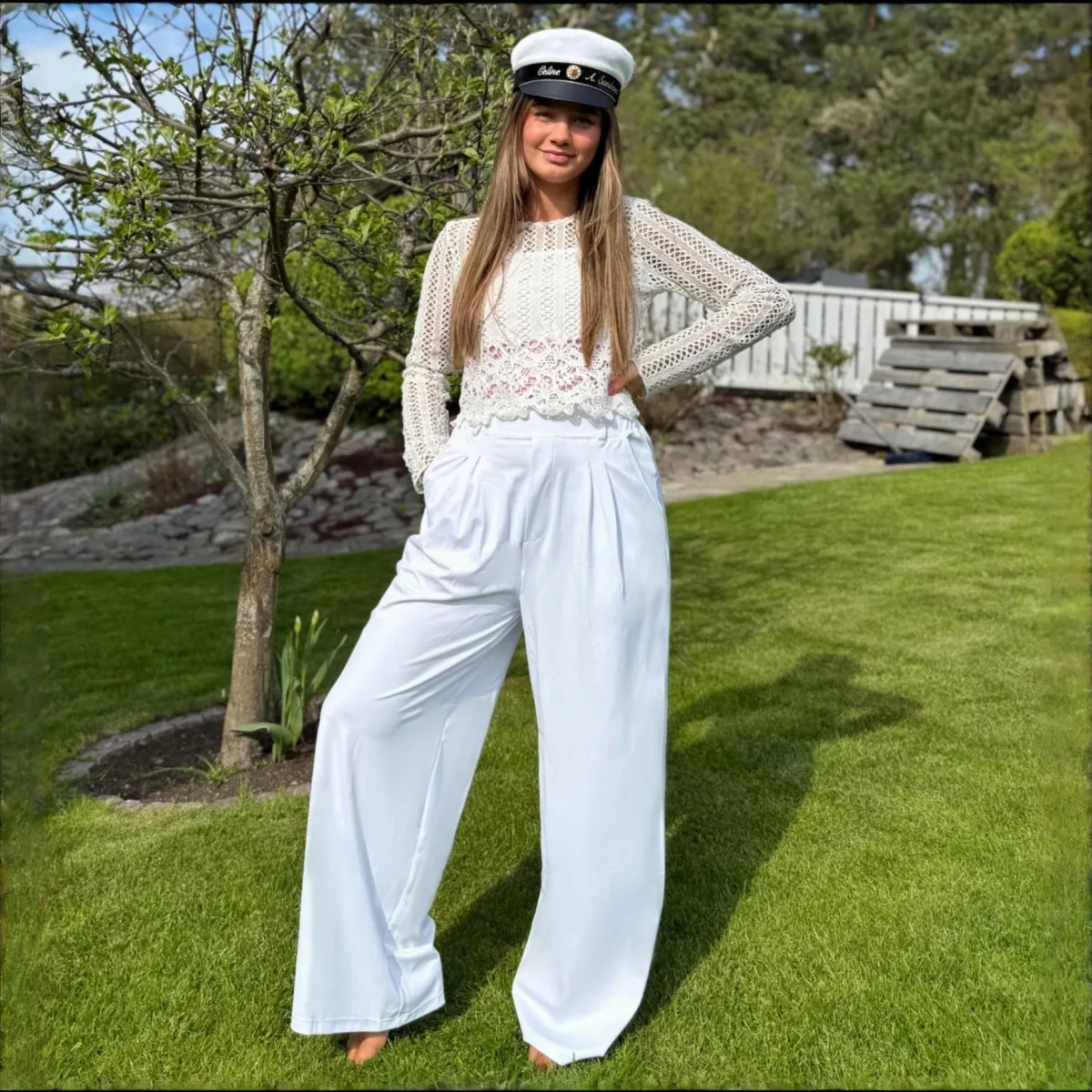 Lyxiga vita byxor med vida ben och ledig passform. Ser ut som kostymbyxor, men känns som mjukisbyxor. Tillverkade i vår vanliga sköna polyesterblandning. Praktiska öppna fickor på benen. Extra hög midja med bälteshållare. Passar en aktiv livsstil och även perfekt för golfbanan. Innerbenslängden på dessa byxor är 70 cm / 27,5 tum i alla storlekar. Totala längden är 108 cm inklusive midjan. Korta Sköna Byxor passar personer som är ca 166-171 cm.