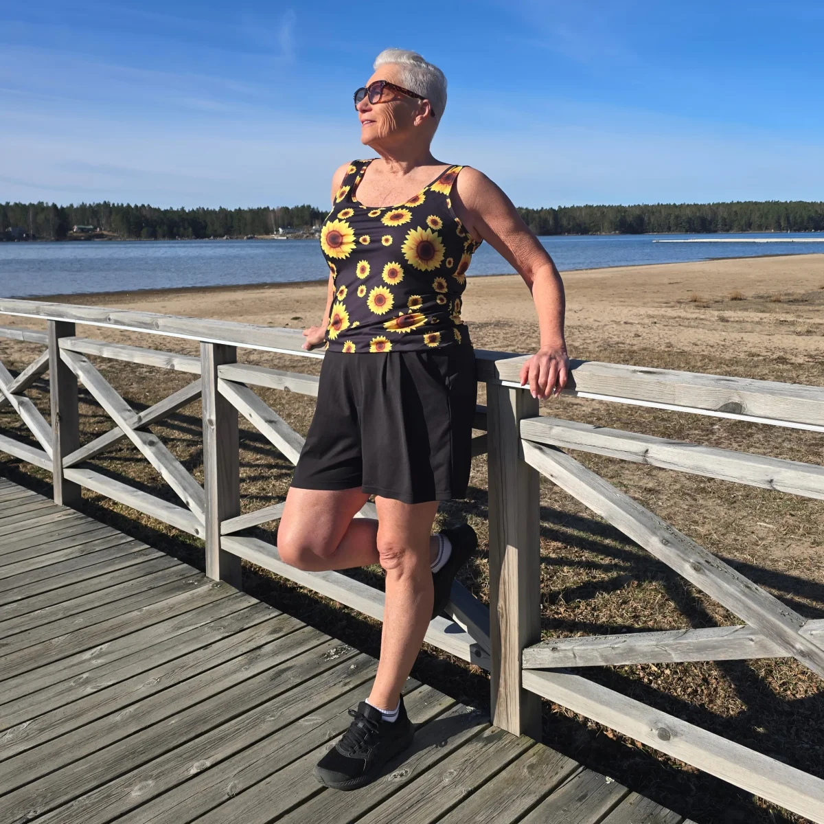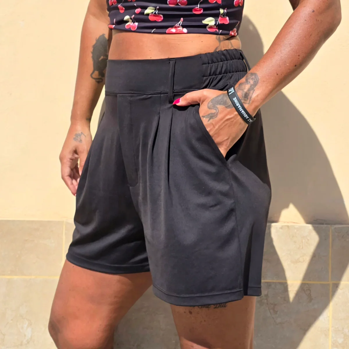 Lyxiga svarta shorts med vida ben och ledig passform. Perfekt både för sport, en aktiv livsstil och fest. Tillverkade i vår vanliga sköna polyesterblandning, med praktiska öppna fickor på benen. Extra hög midja med bälteshållare. Passformen är baserade på våra populära Sköna Byxor. Vill man ha dem lite tightare kan man gå nedåt en storlek. Se storleksguiden för byxorna bland produktbilderna.