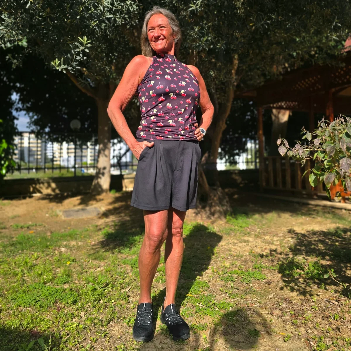 Modellen vid beiga väggen och i videon är 174 cm och bär storlek L. Modellen i trädgården är 167 cm och bär storlek M. Modellen vid stranden är 170 cm och bär storlek L.
