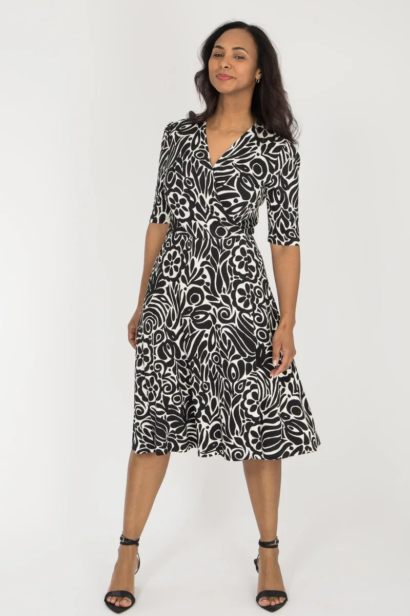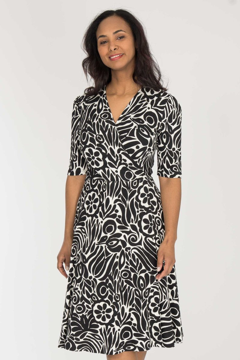 Slip-On wrap är en omlottmodell utan knytband – fastsydd i midjan och lätt att dra på. Både överdelen och kjolen går omlott framtill och formar en klänning som sitter fint och är enkel att bära. Kjolen är knälång, klockad med vidd. Klänningen har korta ärmar med rynk upptill.