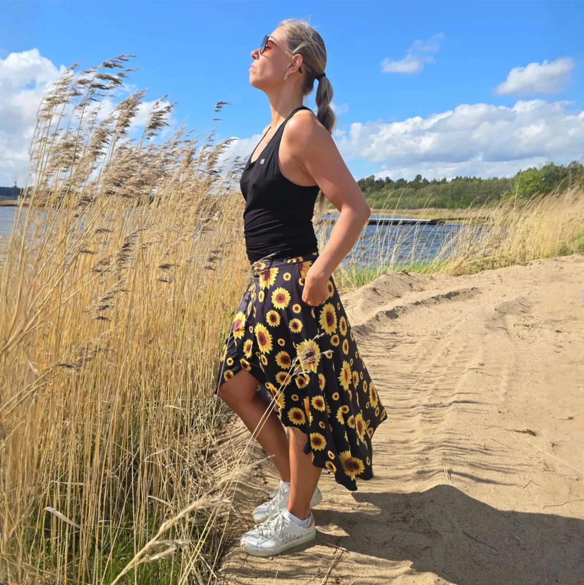 En lång byxkjol i tunnare tyg med härligt solrosmönster. Omlottdetaljen gör kjolen extra somrig. Skapad för en skön vardag och en aktiv livsstil. Den här byxkjolen har två vanliga handfickor på utsidan för förvaring av nycklar, mobil och exempelvis bollar och andra tillbehör om du spelar golf. Den har hög midja och två mobilfickor på innershortsen. Kjolen är skapad för en aktiv livsstil och passar lika bra för vardag och fest.