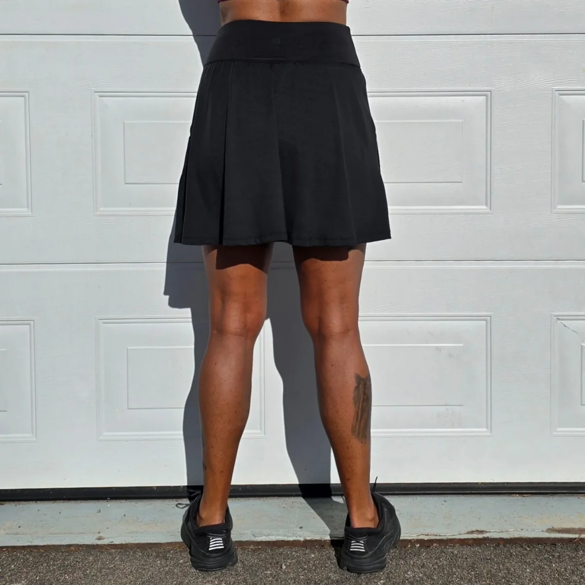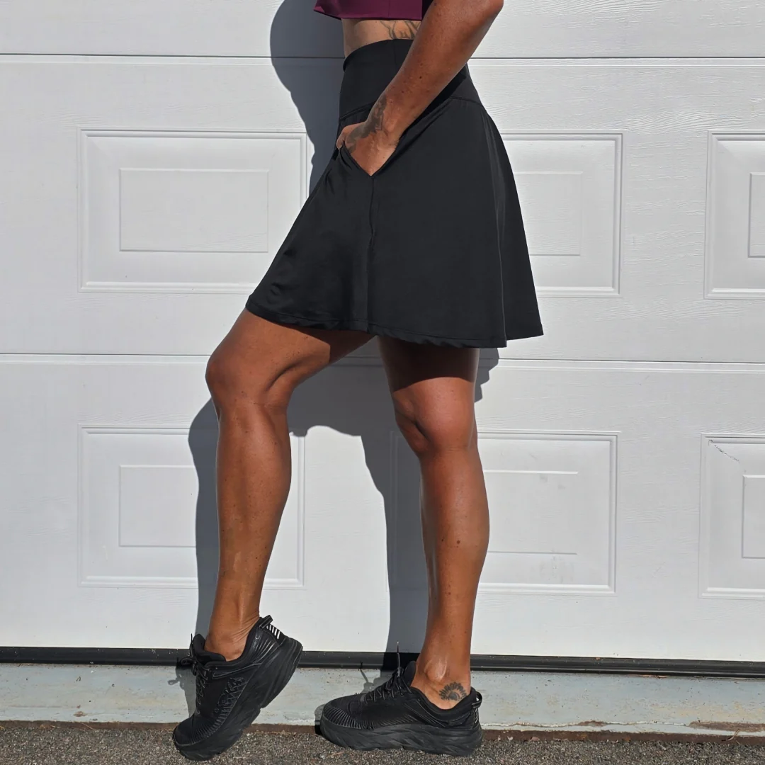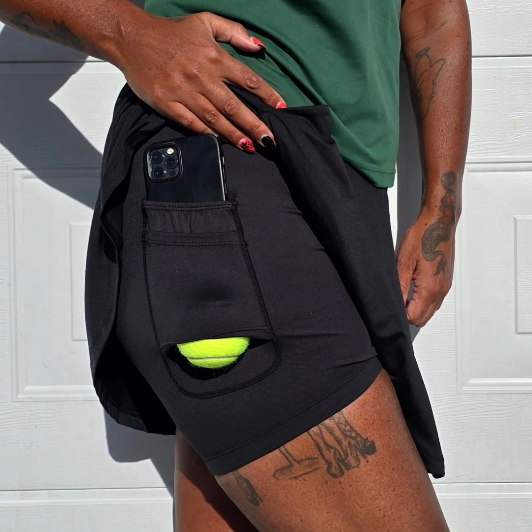 Svart byxkjol i tunnare tyg och fickor utanpå. Innershortsen har två rymliga mobilfickor och två diskreta hållare där du enkelt kan fästa padelbollar, näsduk eller hundpåsar. Ett silikonband hindrar shortsen från att rulla upp när du rör dig. Den passar all aktivitet men är även fin och praktisk till vardag och fest. Hitta din storlek HÄR . OBS! Något större i passformen än våra vanliga smarta byxkjolar.