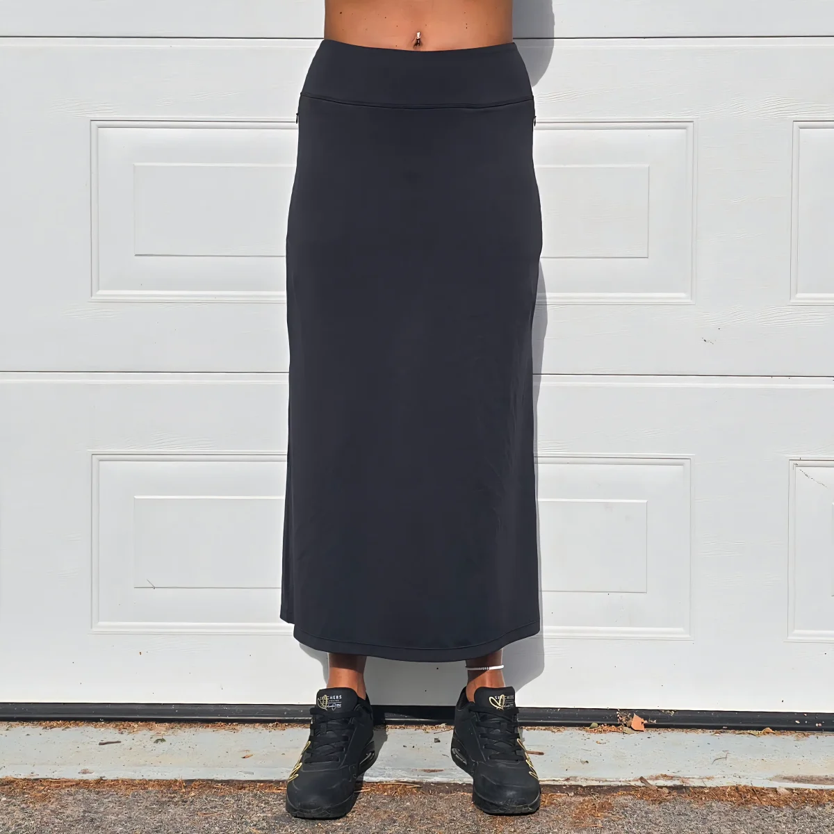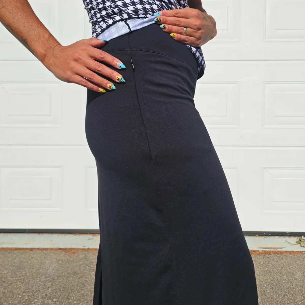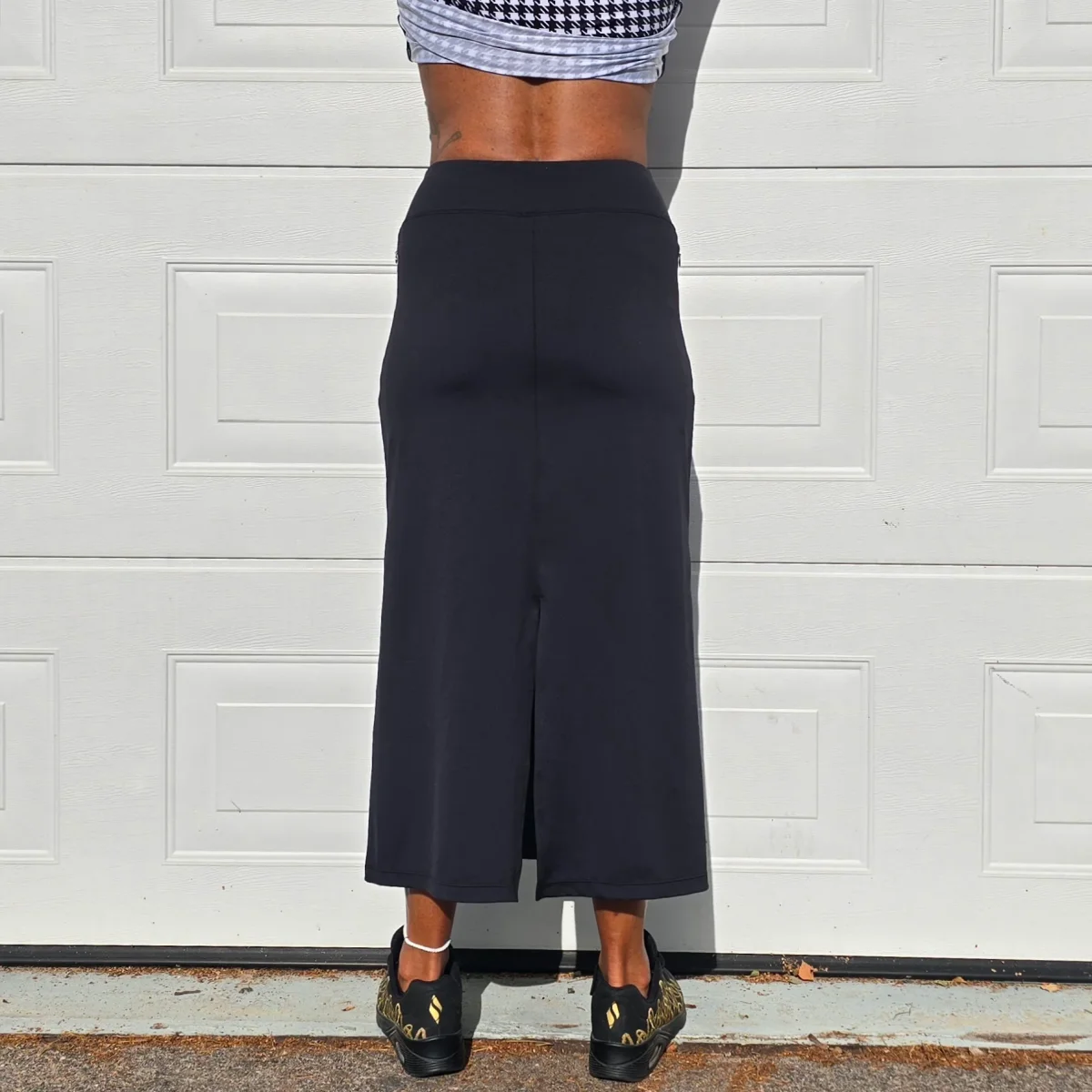 Svart lång byxkjol i vårt standardtyg i en rakare och snävare modell med en stilren slits bak. Diskreta fickor med dragkedja utanpå och fickor på de bekväma innershortsen. Den är stilig och skön till vardags och fest, men också praktiskför promenaderoch golf. Hitta din storlek HÄR . OBS! Något mindre i passformen än våra vanliga byxkjolar, så man kan gå upp en storlek.