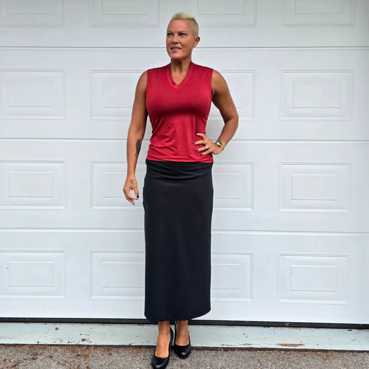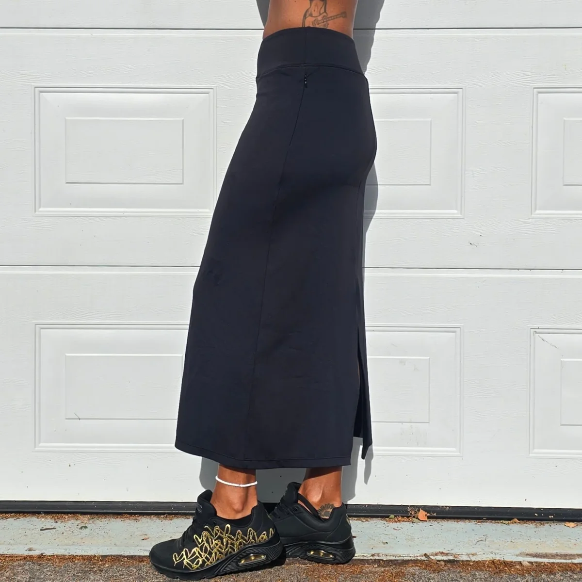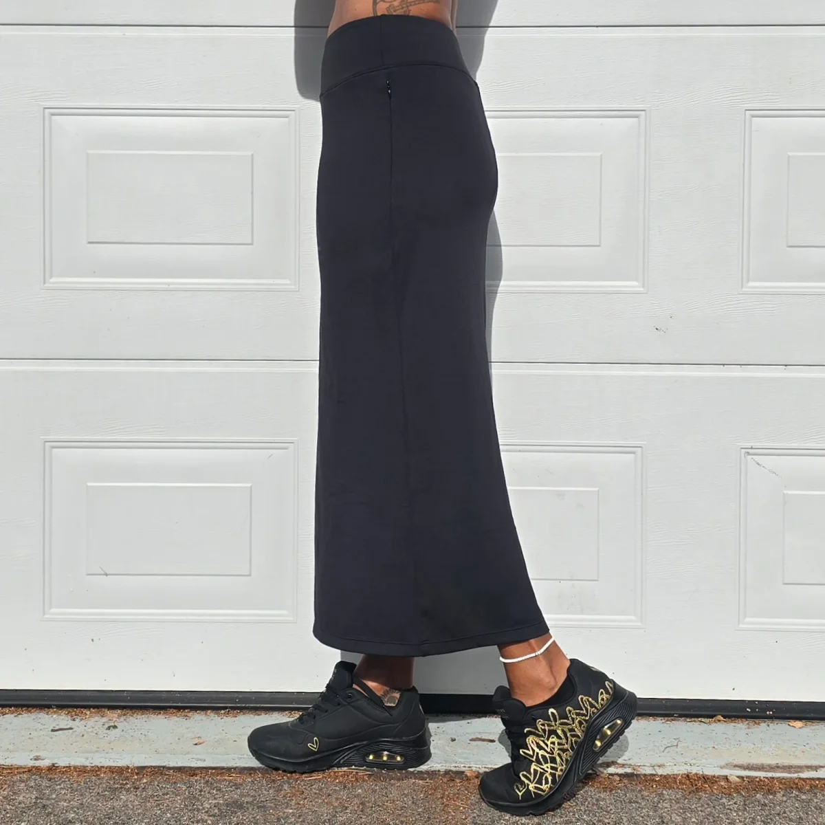 Svart lång byxkjol i vårt standardtyg i en rakare och snävare modell med en stilren slits bak. Diskreta fickor med dragkedja utanpå och fickor på de bekväma innershortsen. Den är stilig och skön till vardags och fest, men också praktiskför promenaderoch golf. Hitta din storlek HÄR . OBS! Något mindre i passformen än våra vanliga byxkjolar, så man kan gå upp en storlek.
