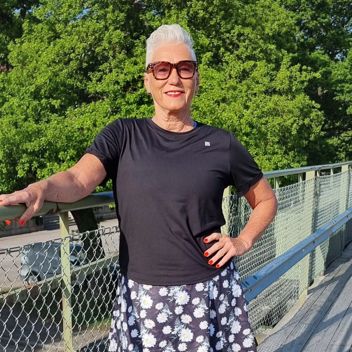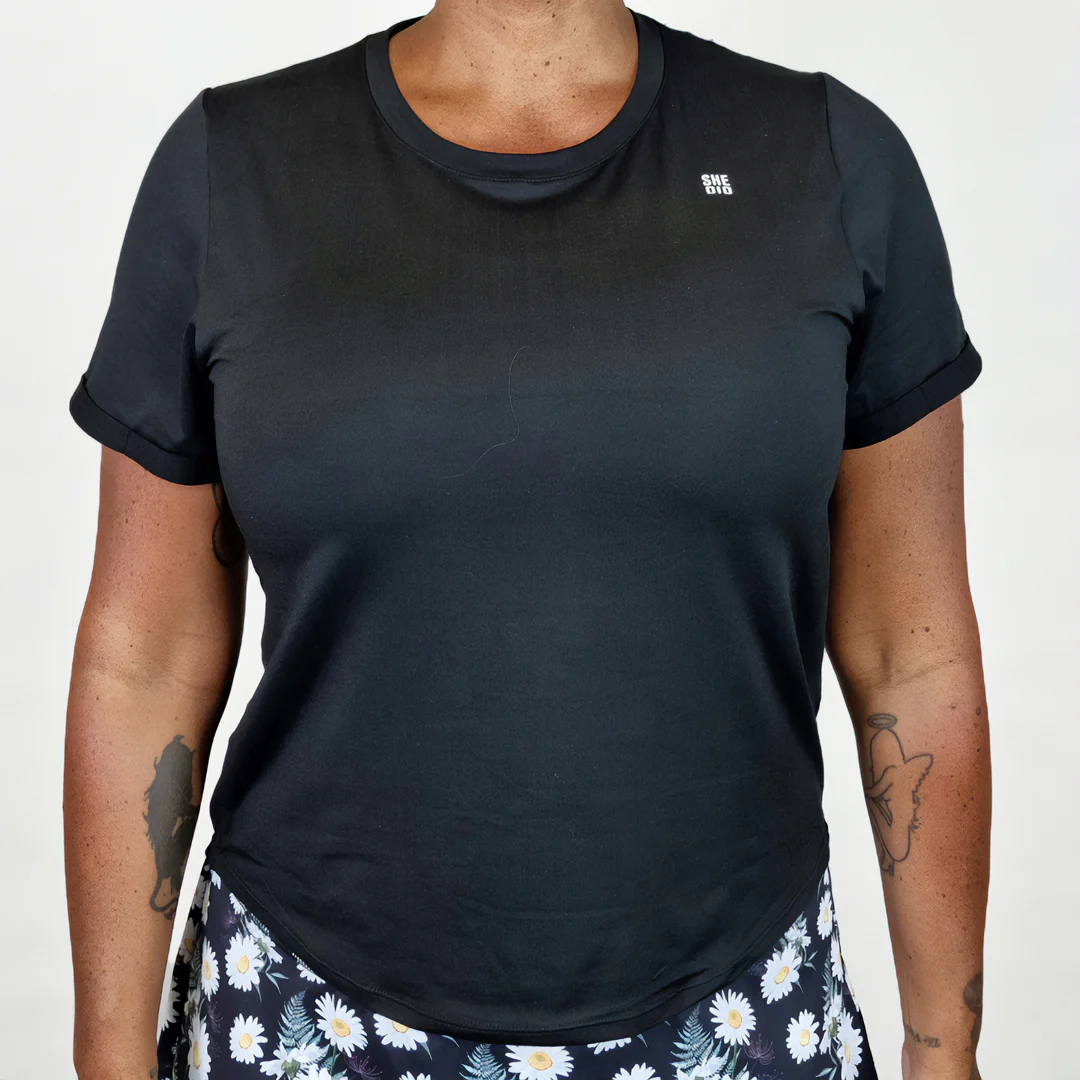 Svart t-shirt i mjukt funktionstyg. Rundad hals och uppvikta ärmar. Formad nedtill för att passa extra bra utanpå tights eller byxkjol. Passar till all form av träning och till vardags.