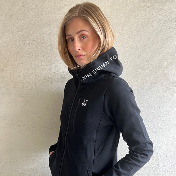 Hoodien har tre stycken fickor, två vid midjan och en försluten ficka med dragkedja på bröstet.