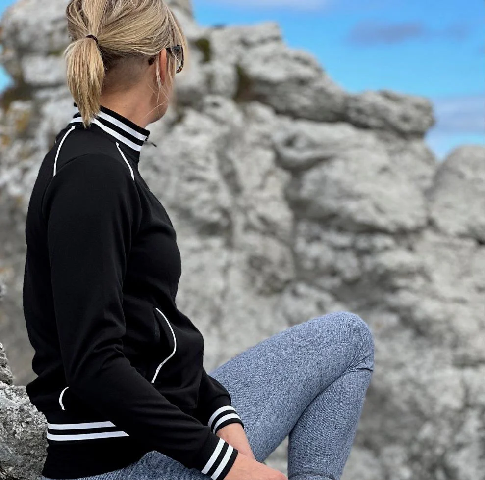 Vår svarta jacka med fräscha vita detaljer ger en elegant sportig look. Jackan har höjd krage och YKK-dragkedja fram. Den har också två fickor med dragkedja samt broderad logo fram och bak. Passformen är ledig, så föredrar du en tajtare passform, bör du gå nedåt i storlek. Du använder jackan till vardags, promenader, till gymmet, när du spelar golf och när du värmer upp i padelhallen.