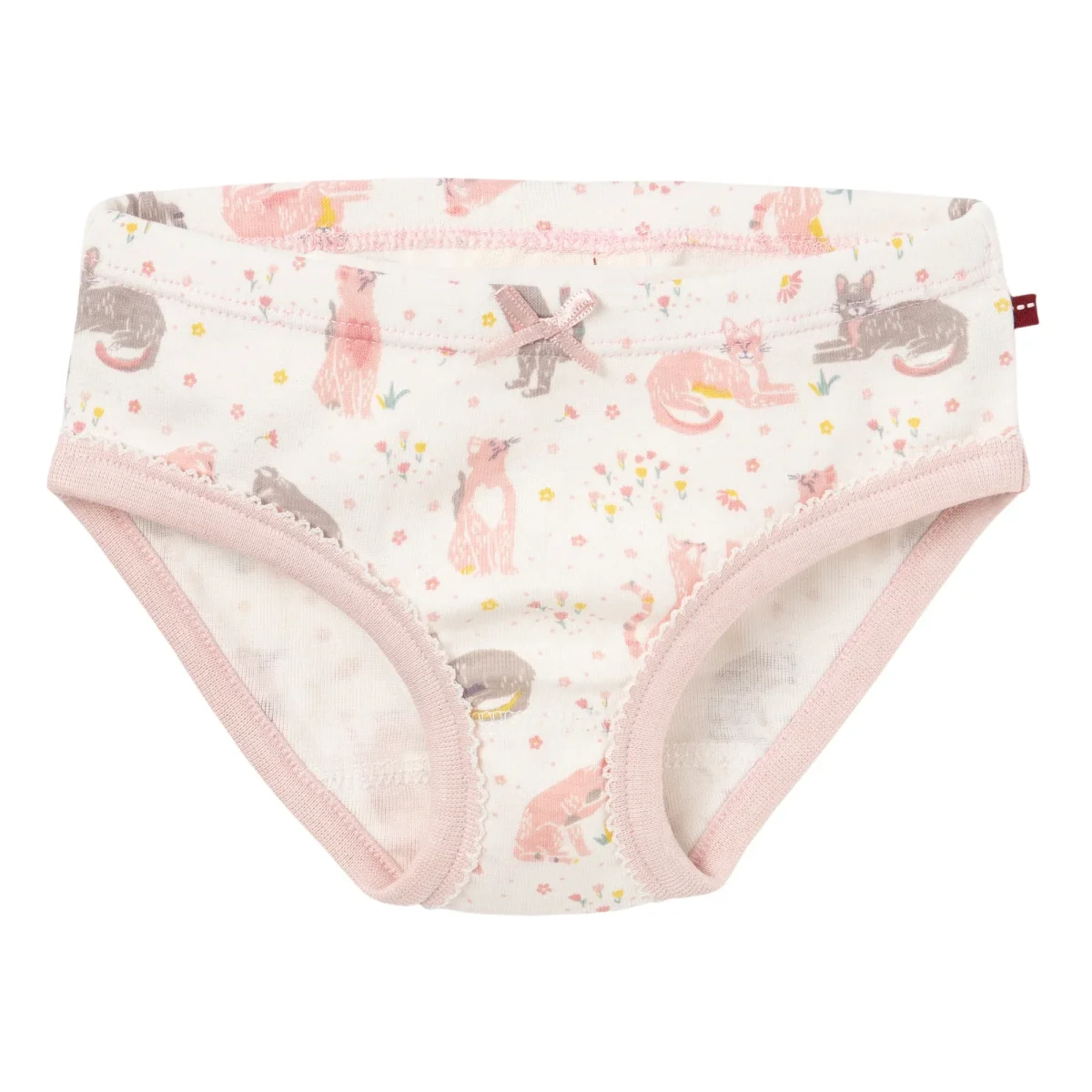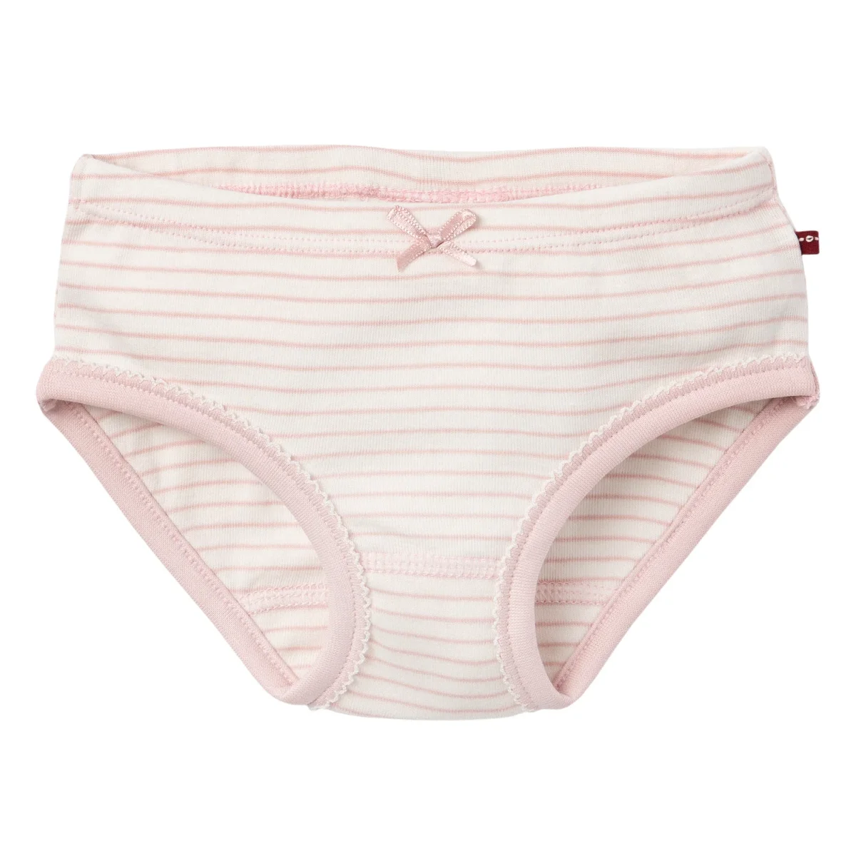 Tvåpack trosor för barn i mjuk och skön ekologisk bomullstrikå. Ett par med kattmönster oh ett par randiga. Söt uddkant och rosett mitt fram.