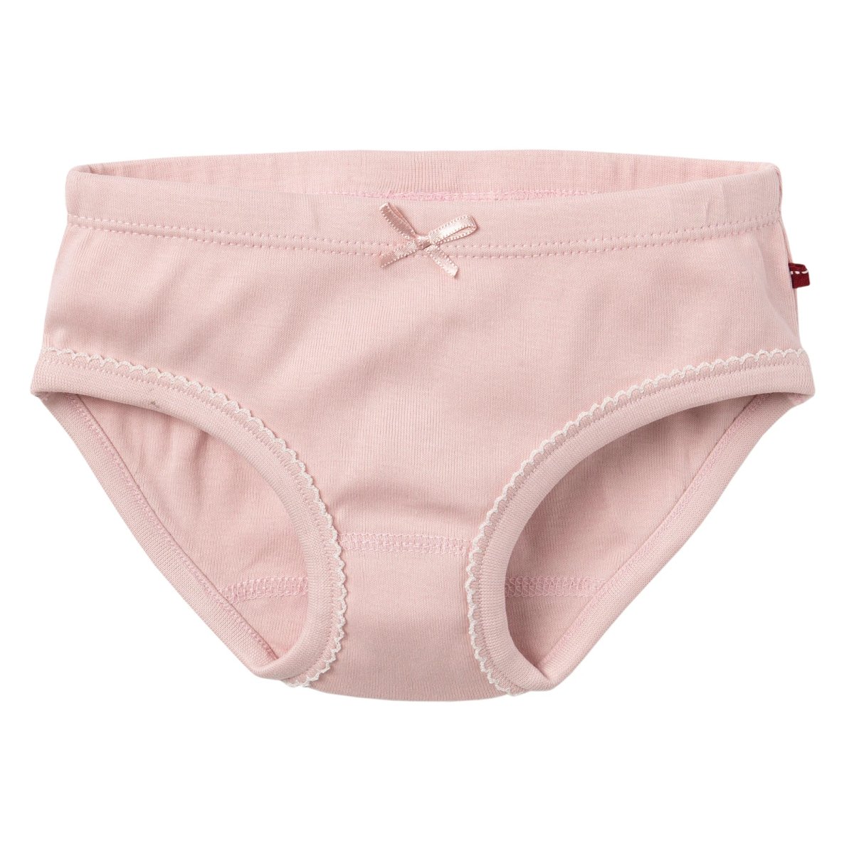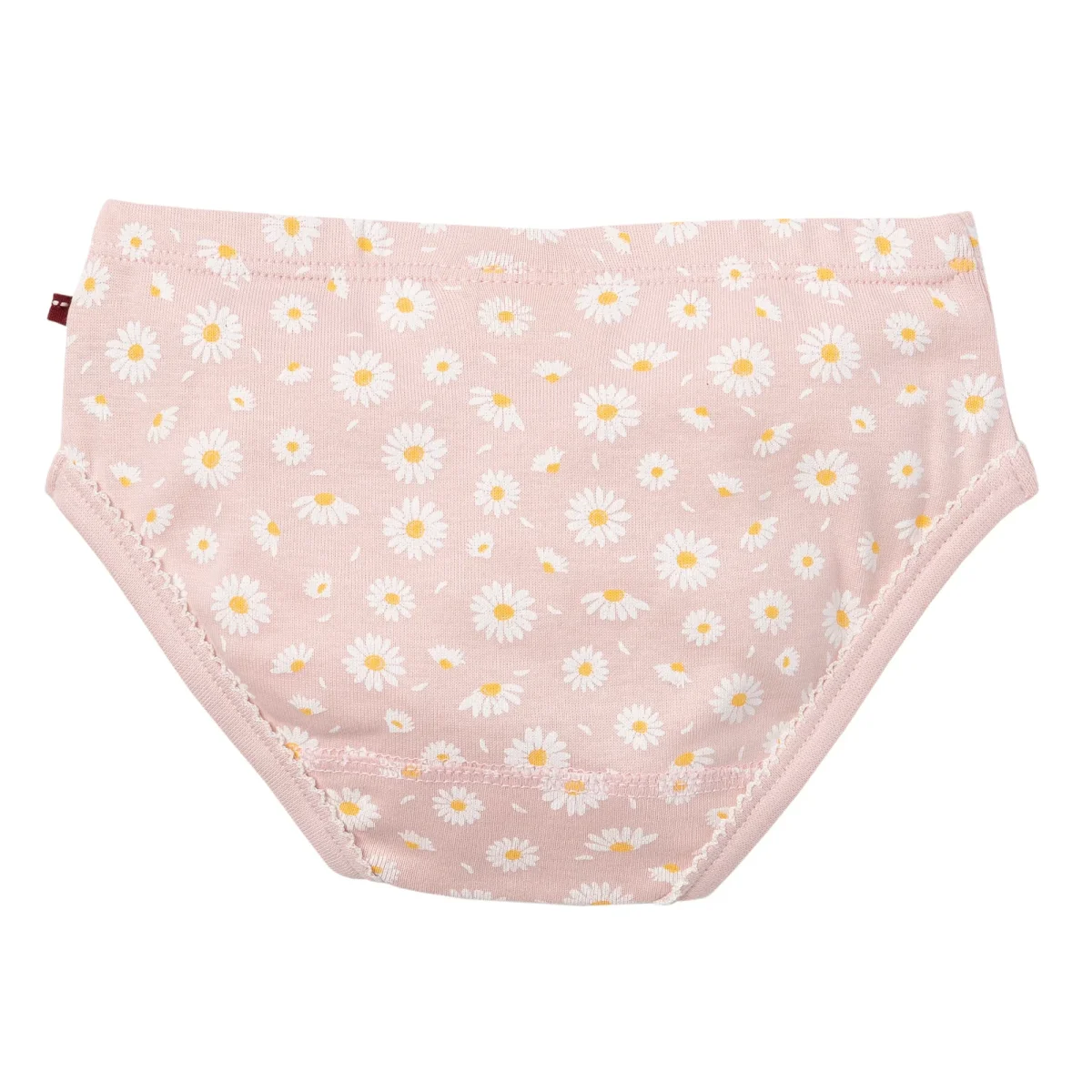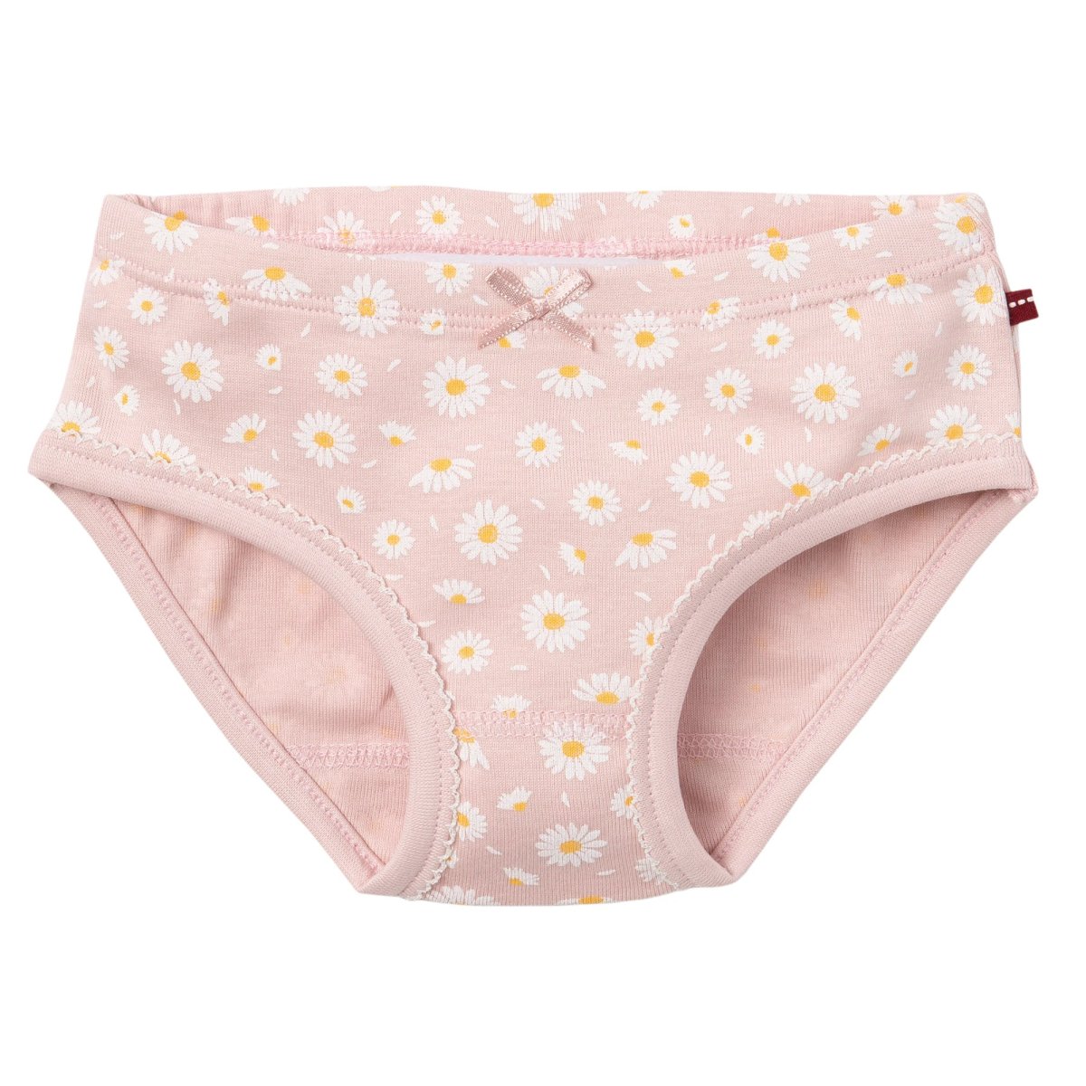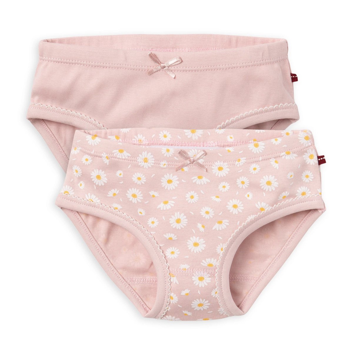 Tvåpack trosor för barn i mjuk och skön ekologisk bomullstrikå. Ett par i rosa med prästkragemönster och ett par enfärgade. Söt uddkant och rosett mitt fram.