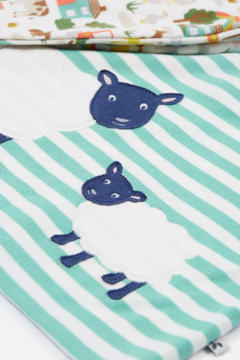 Tvådelat set från Frugi med t-shirt och byxor. T-shirten har fina applikationer med får och knäpps med tryckknappar på ryggen för att underlätta på- och avklädning. Byxorna har ett sött tryck med bondgårdsdjur och uppvikbar mudd i midjan för extra utrymme att växa i. Ett riktigt fint set till sommaren!