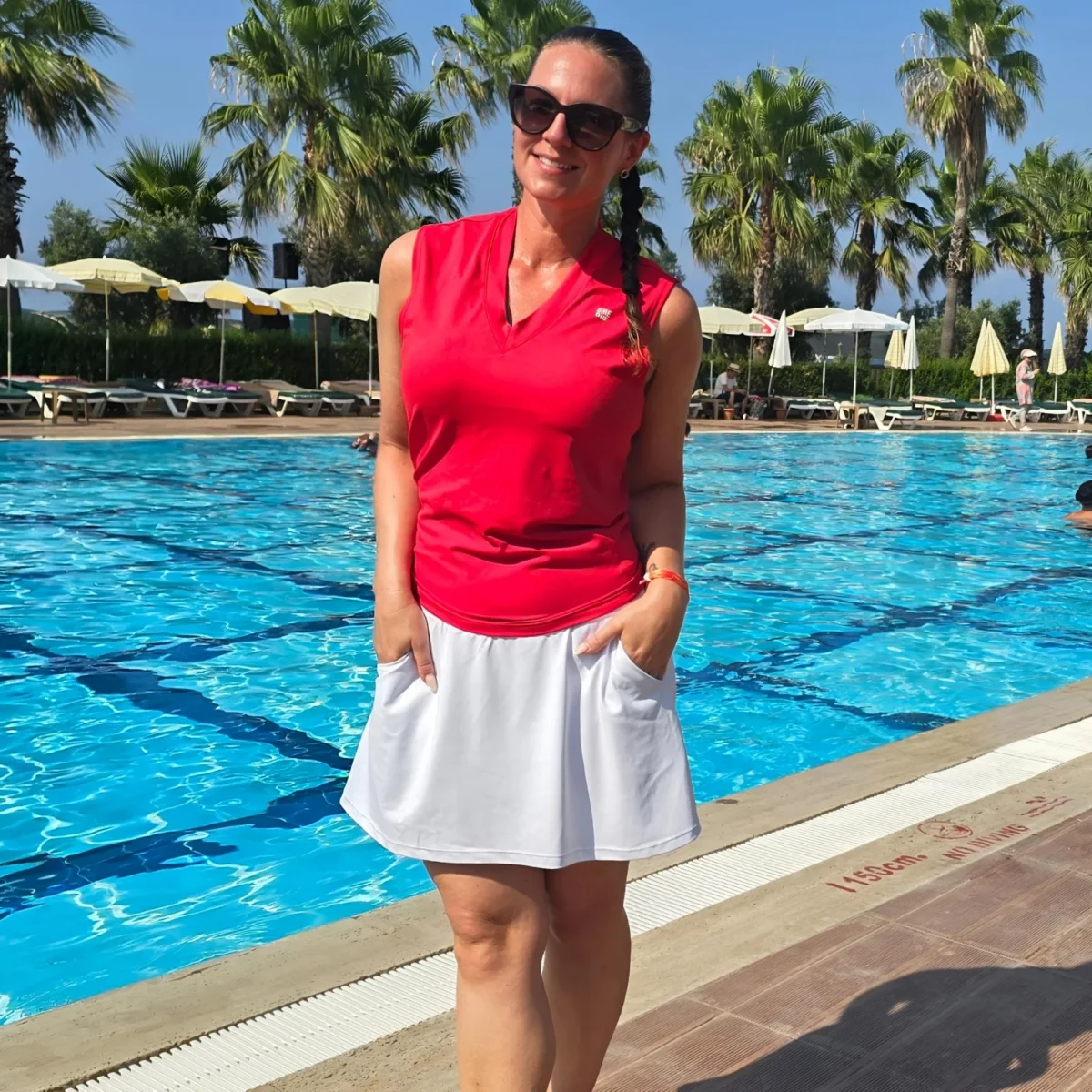 Vit byxkjol med fickor utanpå. Innershortsen har två rymliga mobilfickor och två diskreta hållare där du enkelt kan fästa padelbollar, näsduk eller hundpåsar. Ett silikonband hindrar shortsen från att rulla upp när du rör dig. Den passar all aktivitet men är även fin och praktisk till vardag och fest. Passformen och tyget är densamma som våra smarta byxkjolar. Hitta din storlek HÄR .