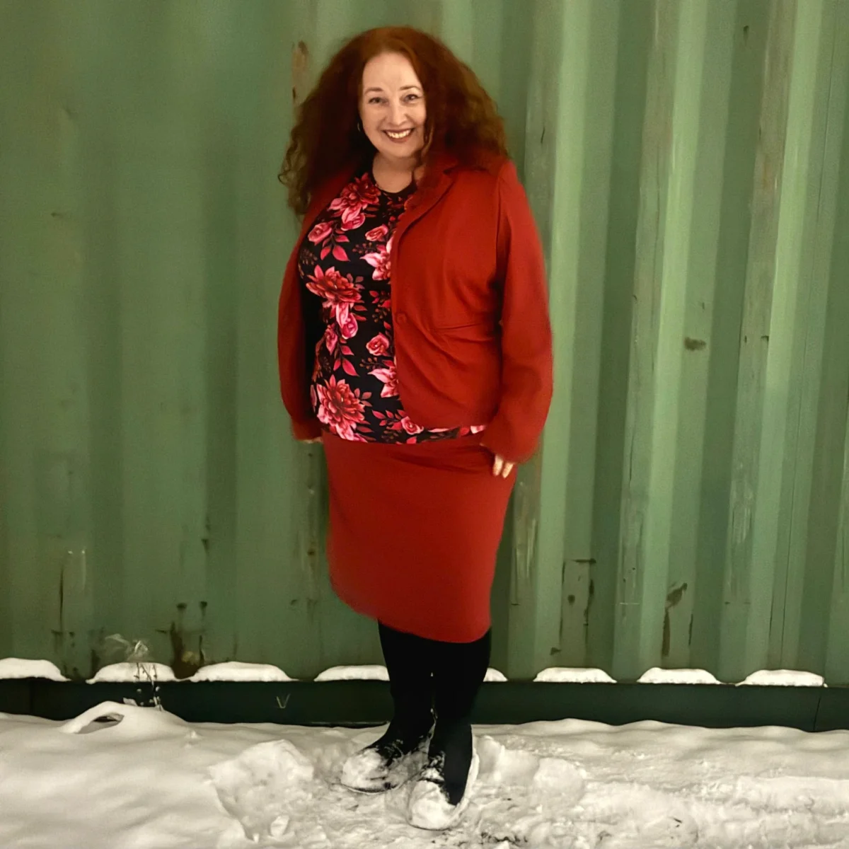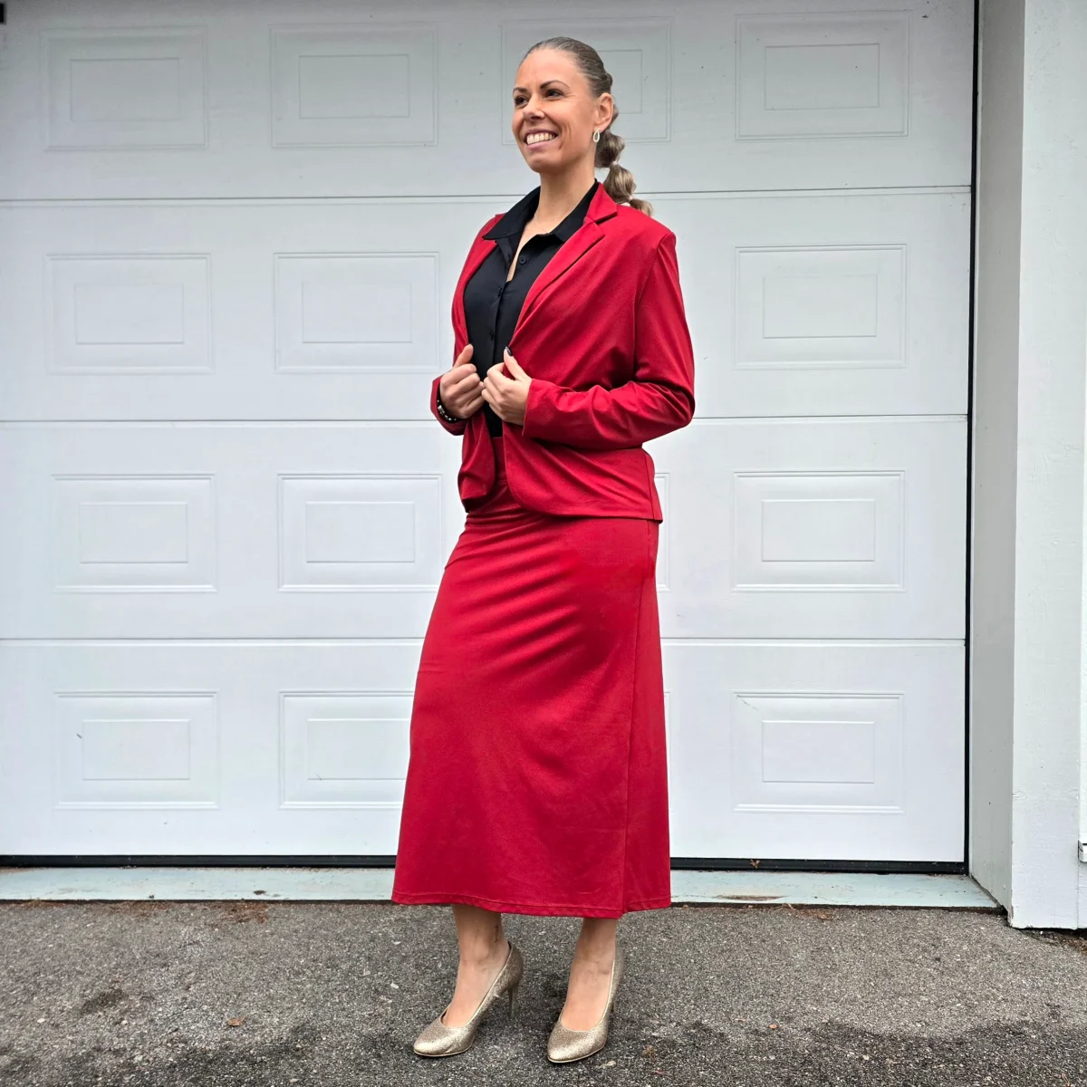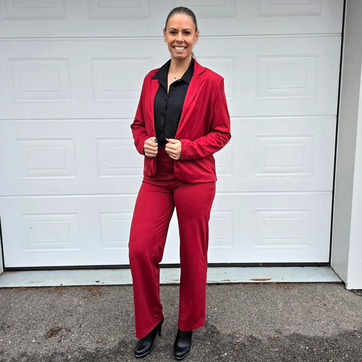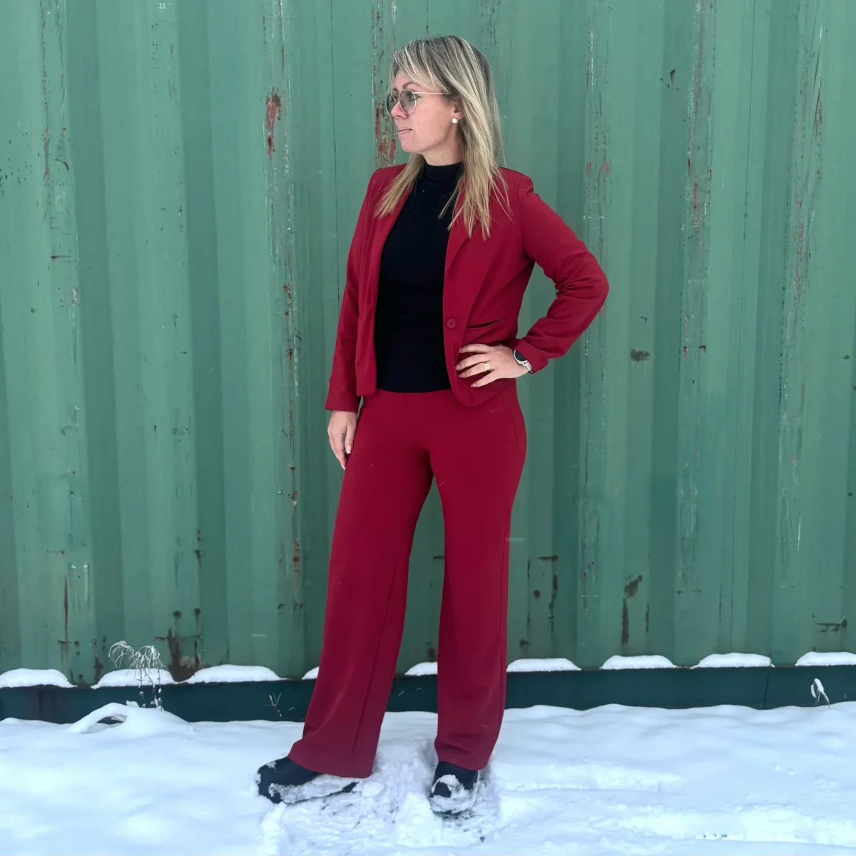 Vinröd enkelknäppt kavaj med fickor fram. Skapad i vårt elastiska tyg passar den lika bra till vardags och fest och är perfekt att matcha med våra kjolar och byxor. Passformen är något snäv, så är du mellan två storlekar rekommenderar vi en storlek större.