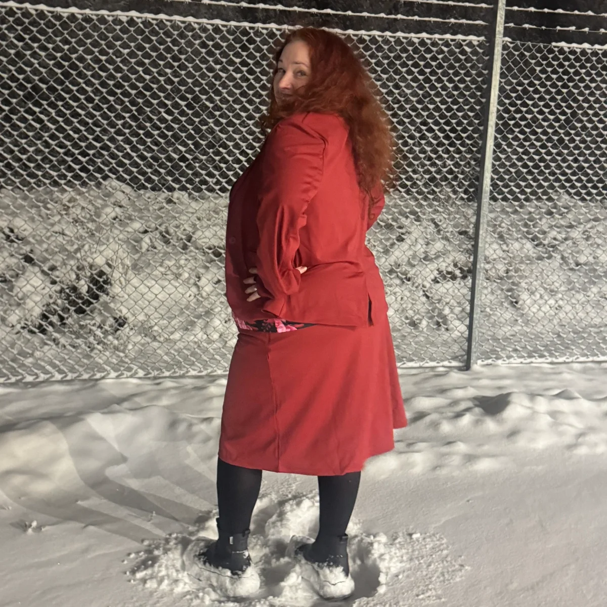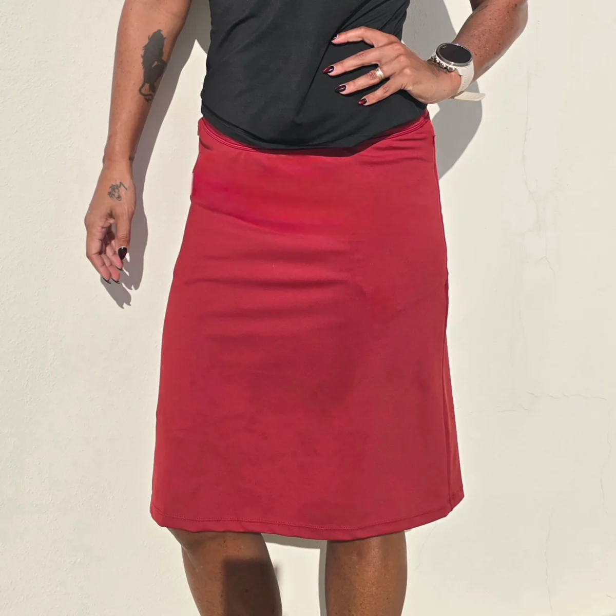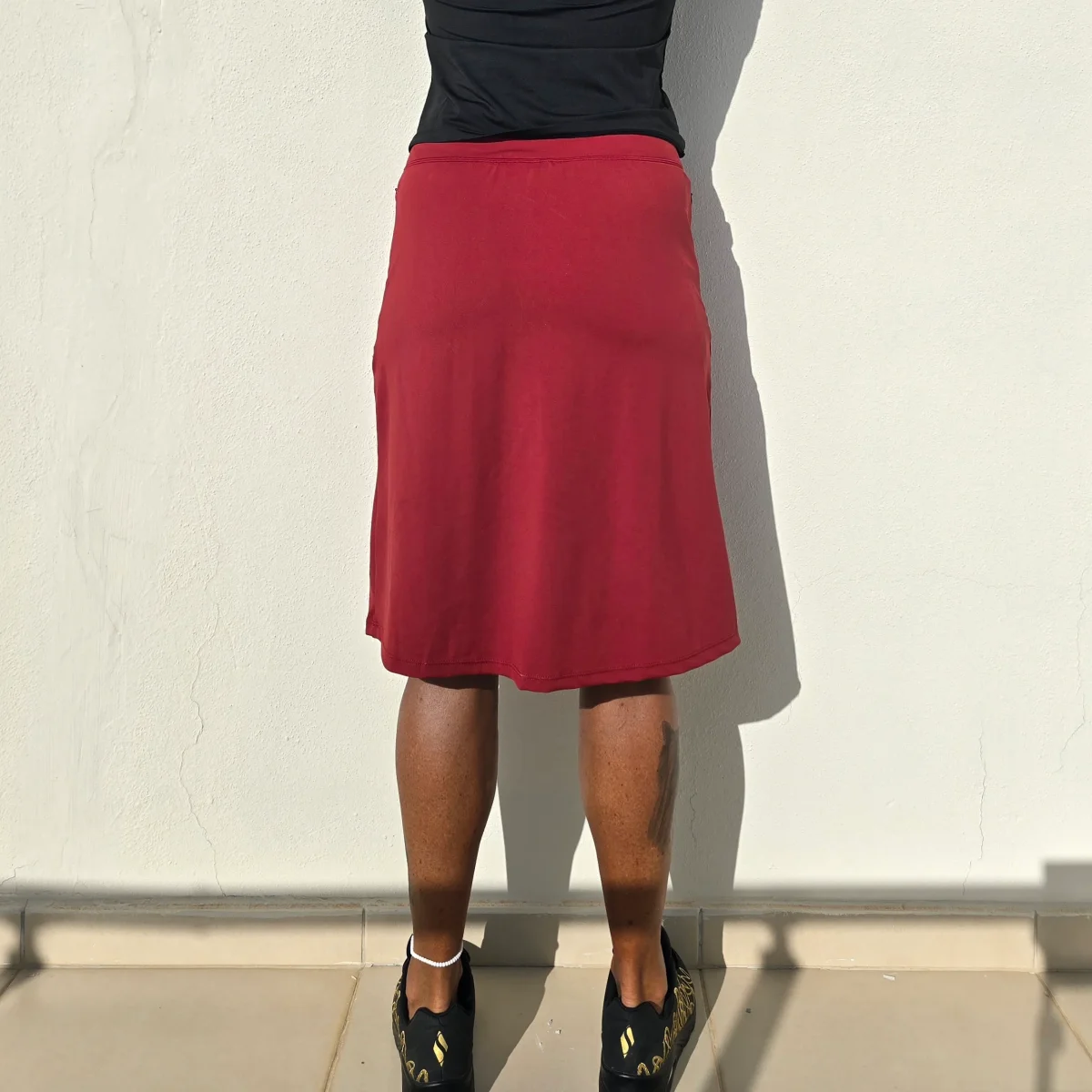 Vinröd knälång byxkjol i vårt standardtyg i en rakare och snävare modell. Diskreta fickor med dragkedja utanpå och fickor på de bekväma innershortsen. Den är stilig och skön till vardags och fest, men också praktiskför promenaderoch golf. Hitta din storlek HÄR . OBS! Något mindre i passformen än våra vanliga byxkjolar, så man kan gå upp en storlek.