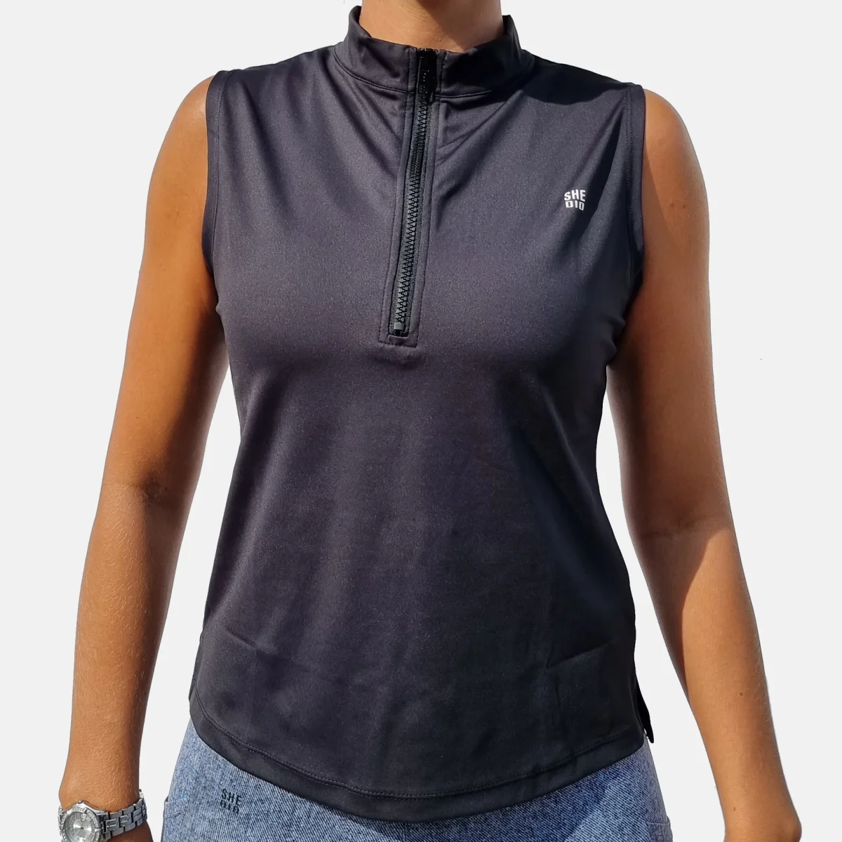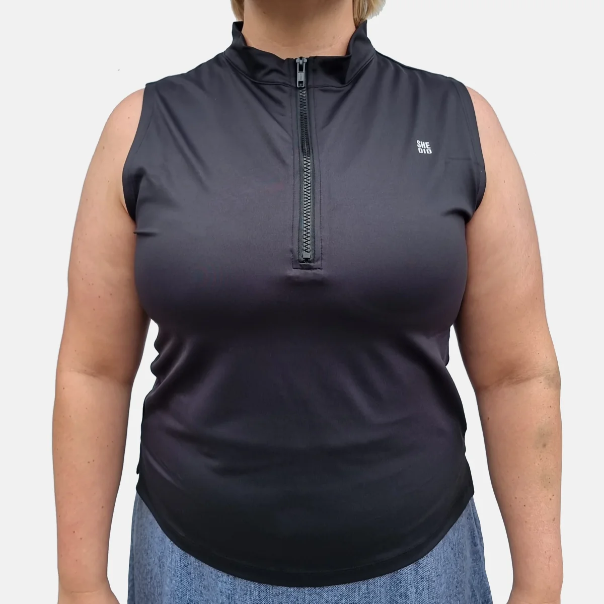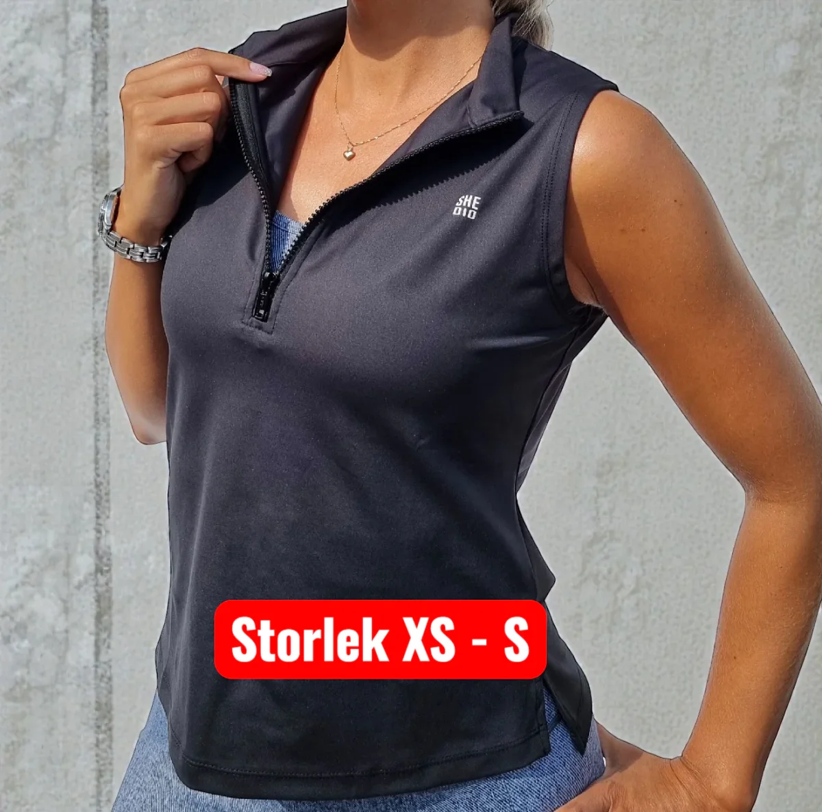 Vårt svarta linne har dragkedja fram och hög krage. Den passar lika bra som att träna i eller bara som den är till vardags. Passformen är ledig, men vill du ha den mer åtsittande är den snygg att stoppa in.