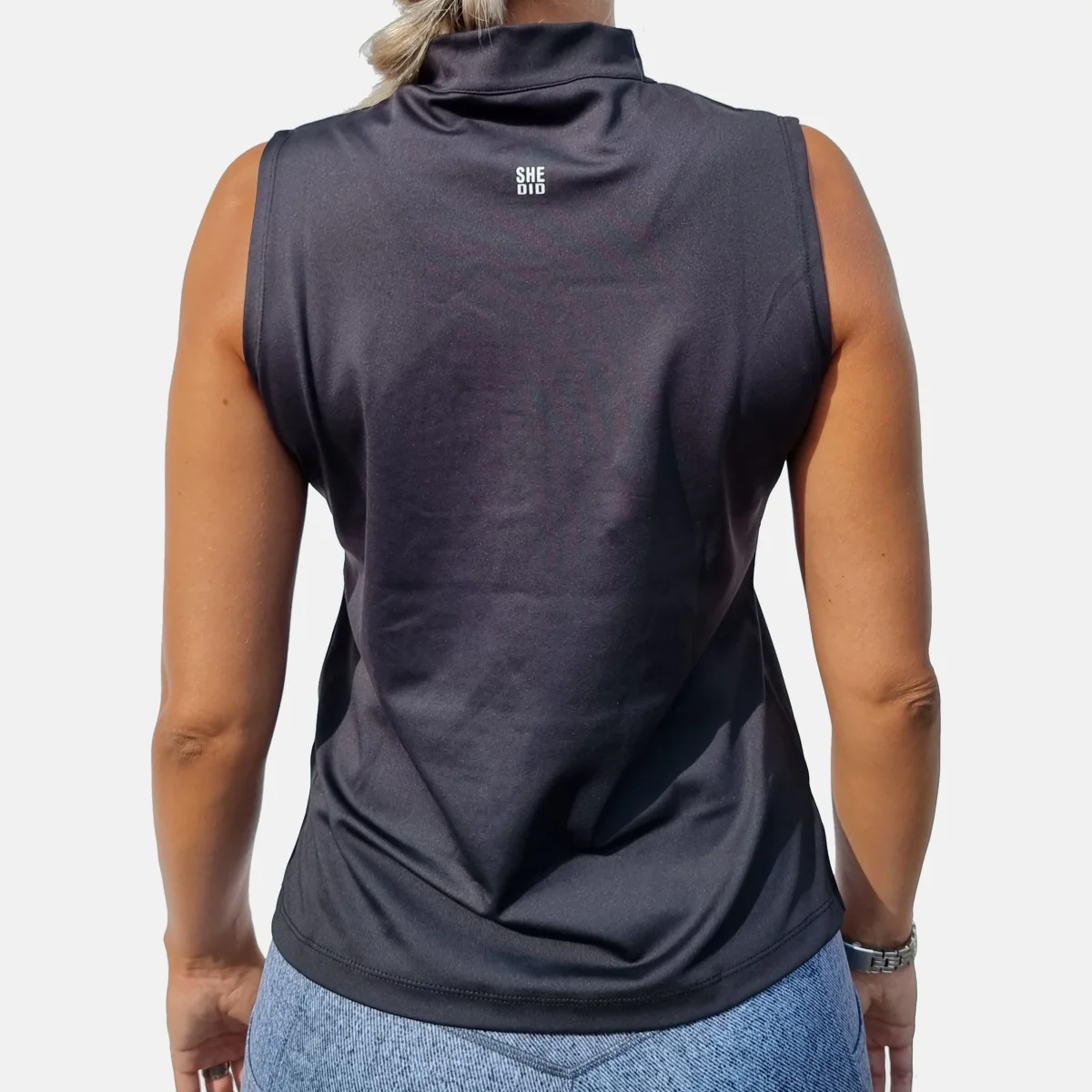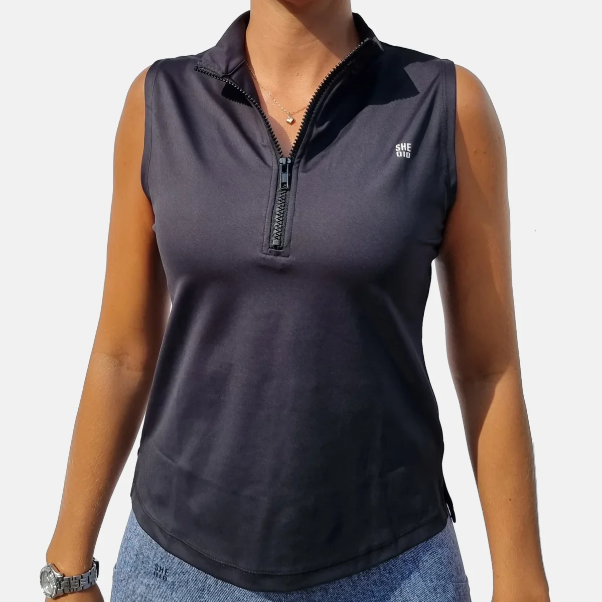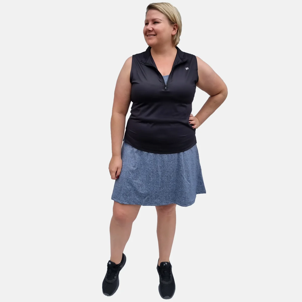 Vårt svarta linne har dragkedja fram och hög krage. Den passar lika bra som att träna i eller bara som den är till vardags. Passformen är ledig, men vill du ha den mer åtsittande är den snygg att stoppa in.